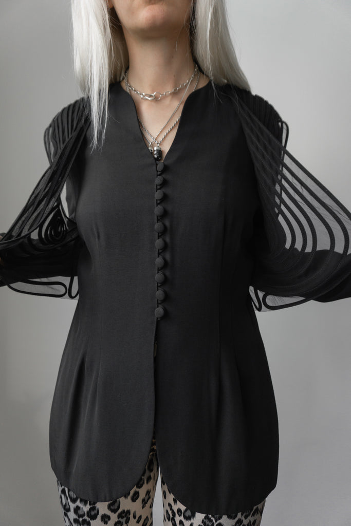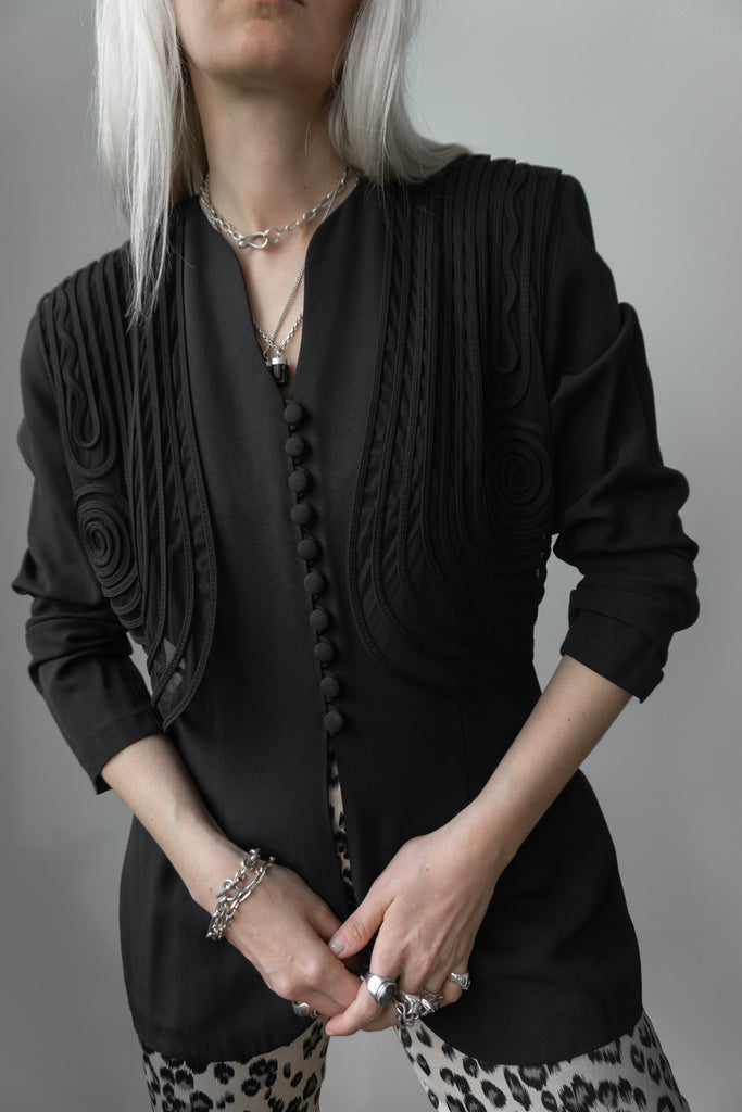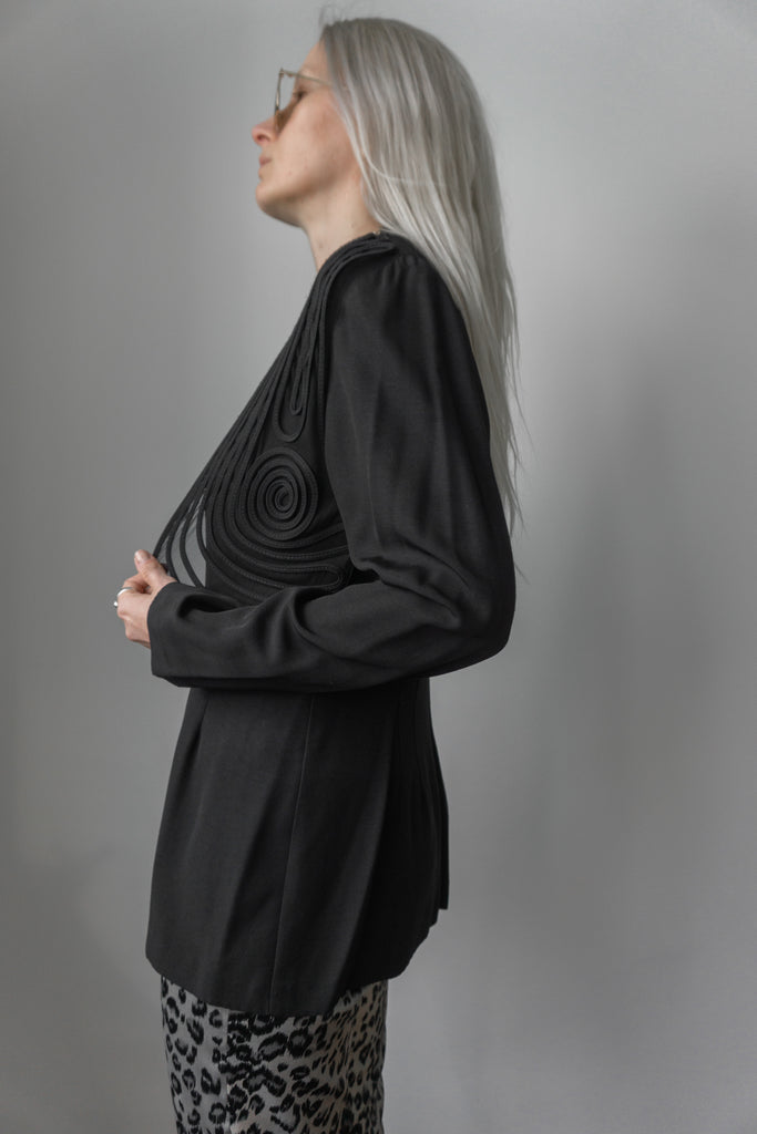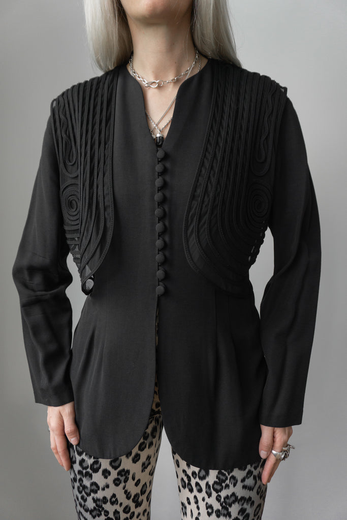Avant-garde blazer with layered effect by Joseph Ribkoff. Unusual button placket and beautiful waist.