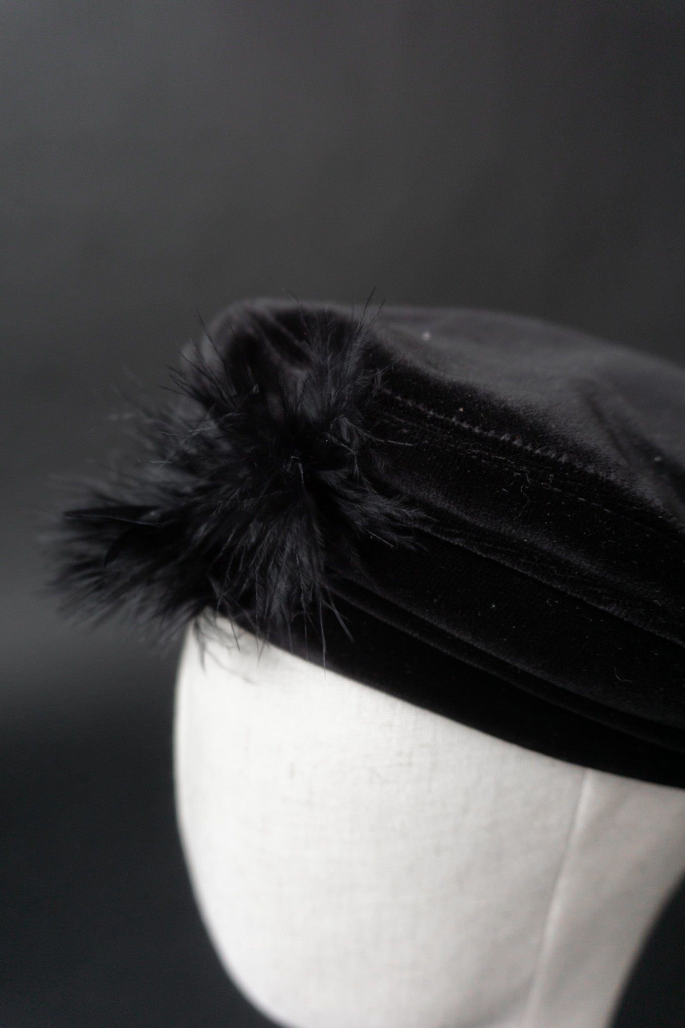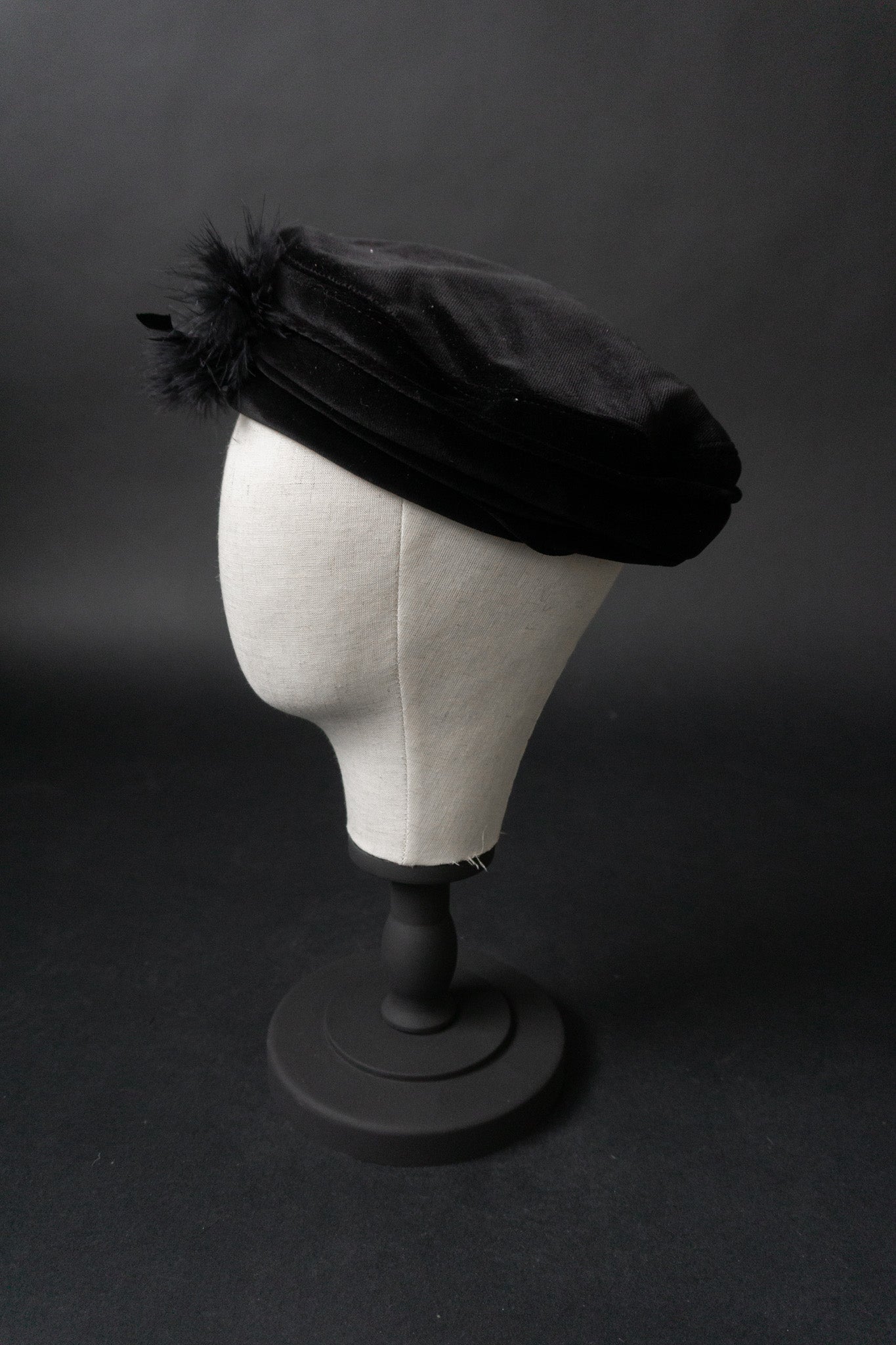 30s Samt Baret Mütze, Feder, Schwarz, schwedisch, 54