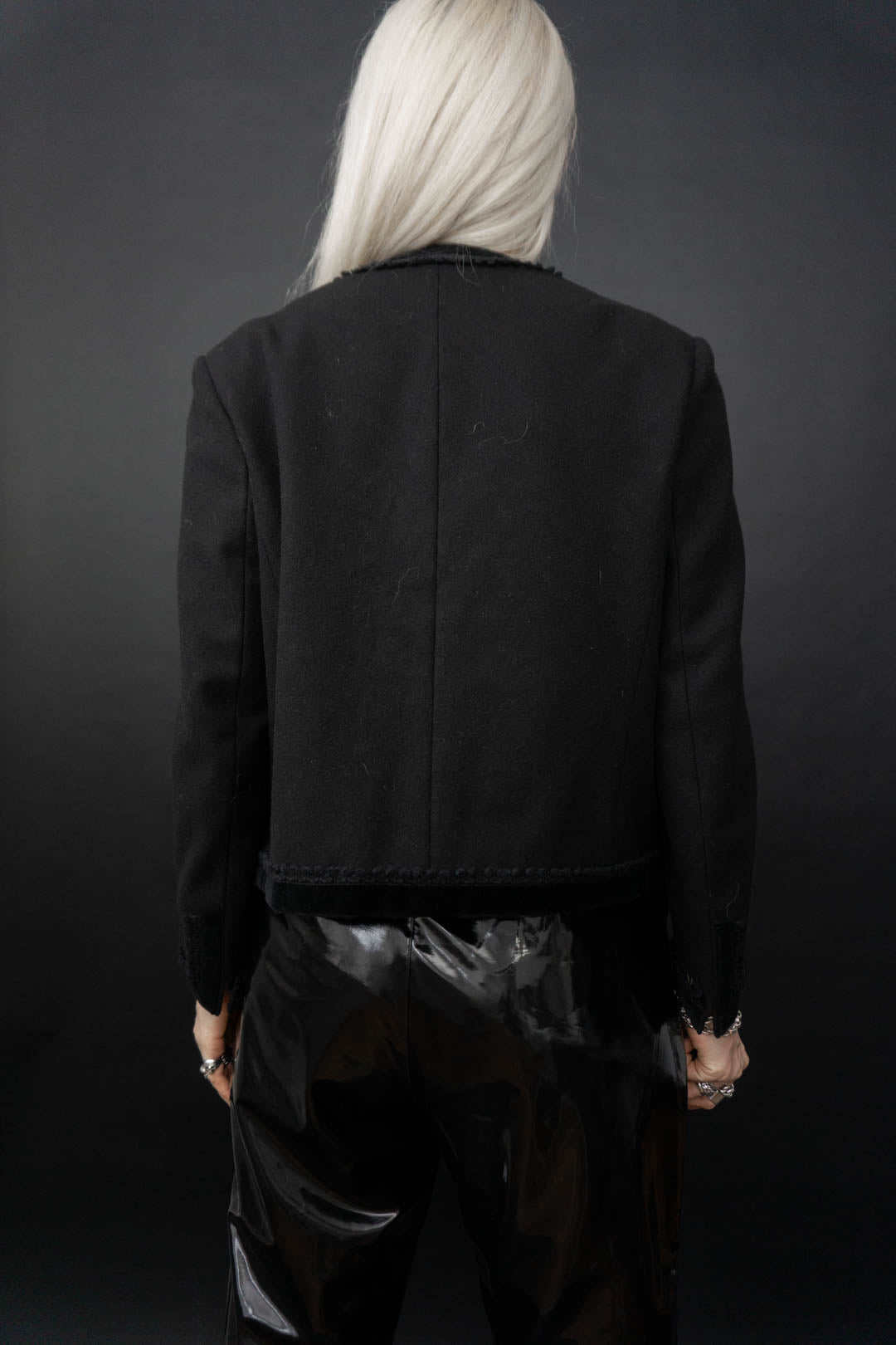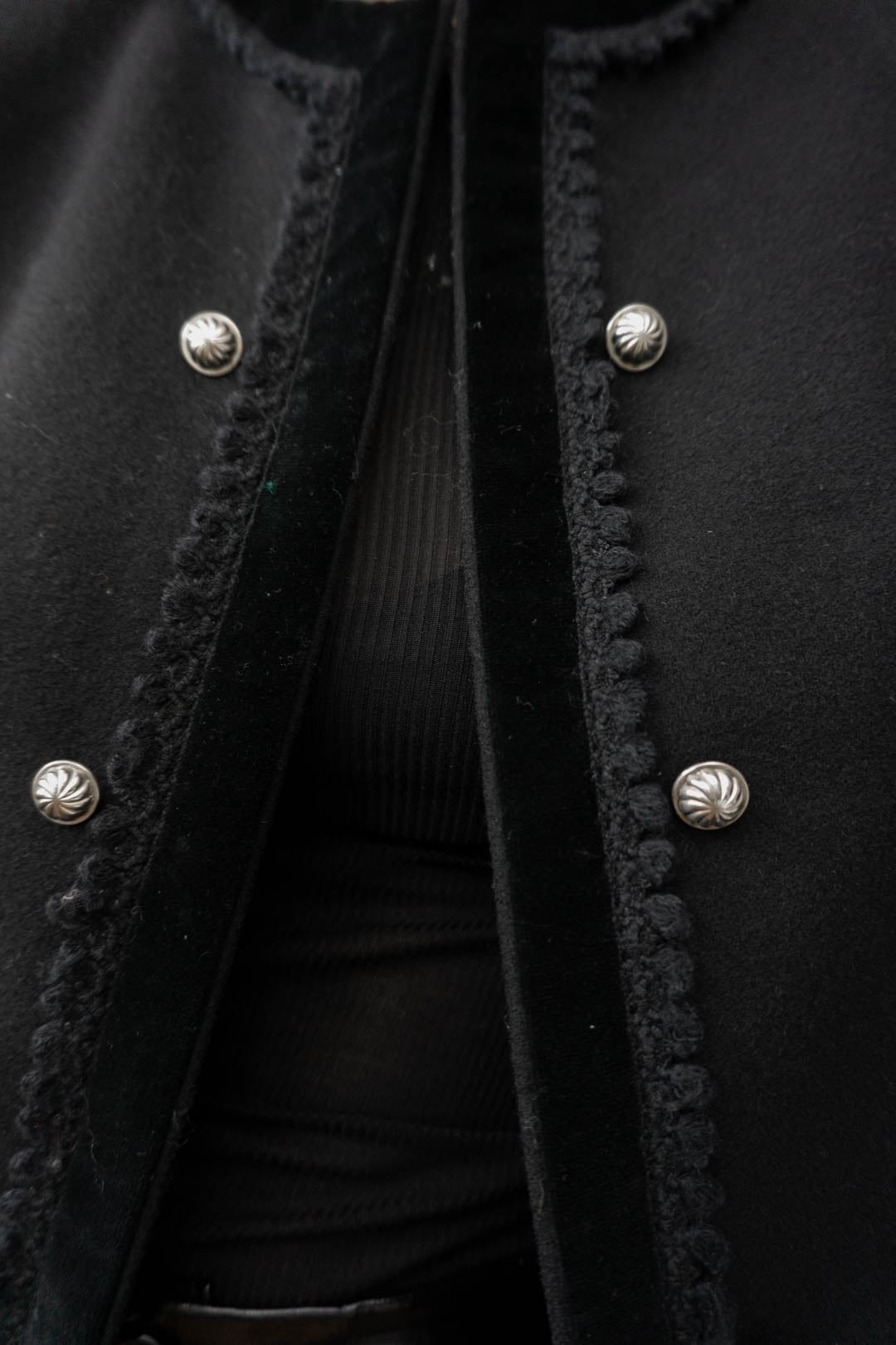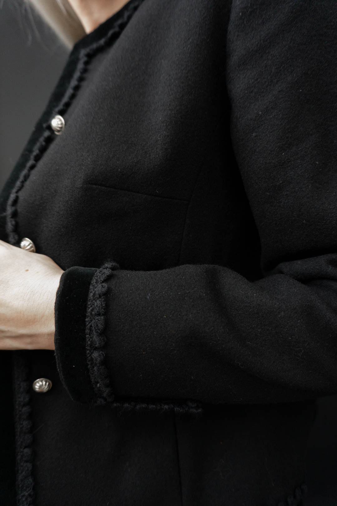 Cropped Blazer von Bogner mit Samtpaspel und silbernen Knöpfen. Wird offen getragen.