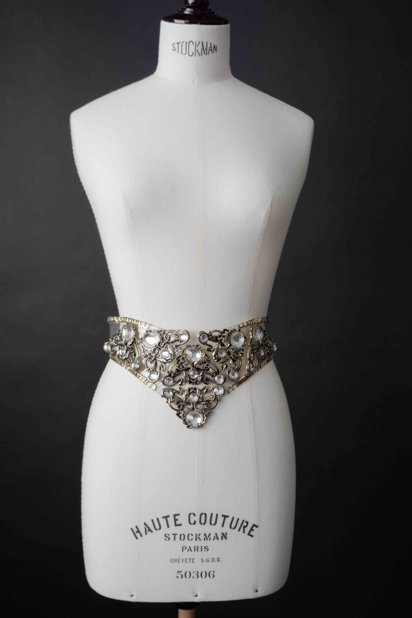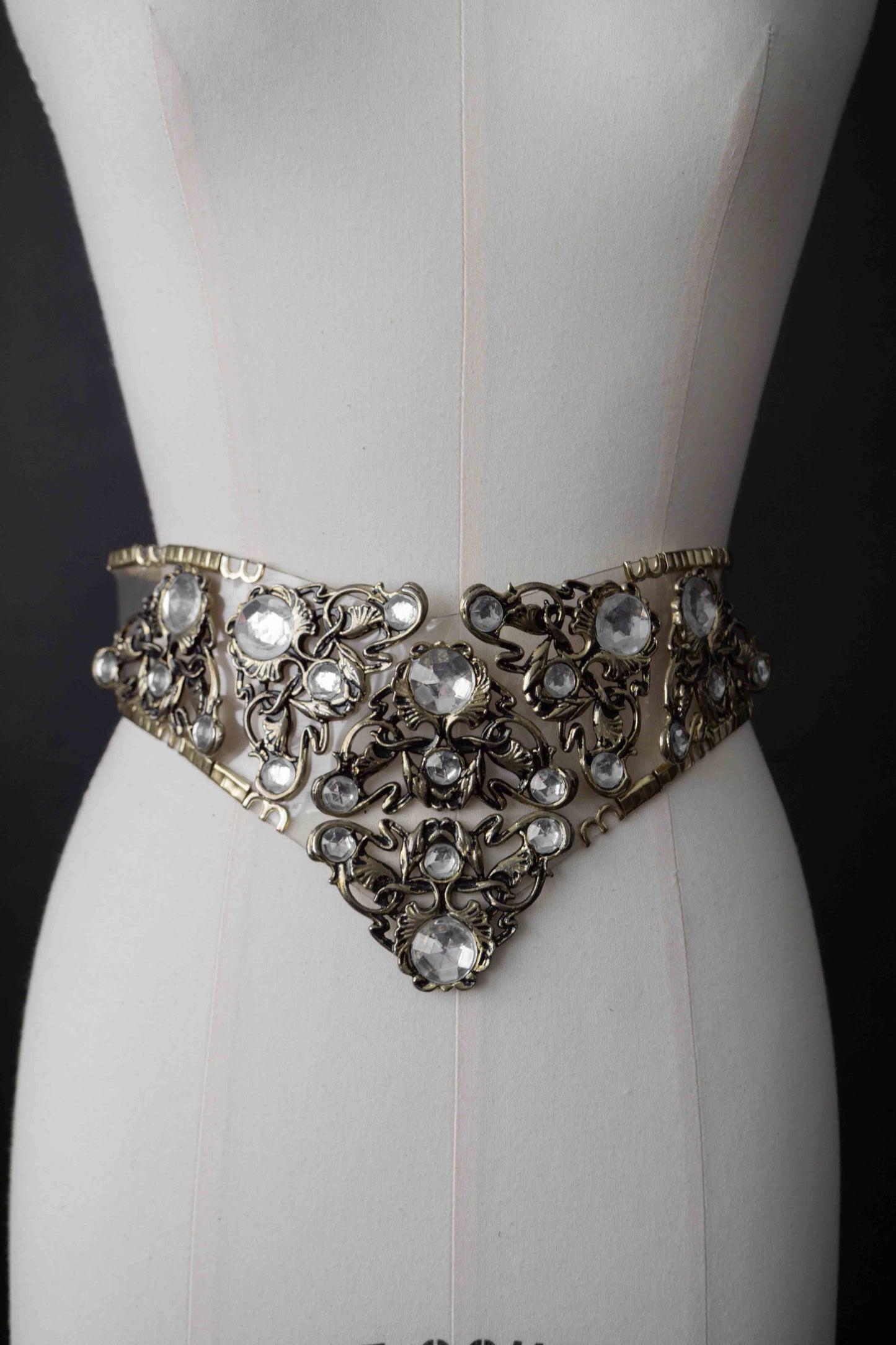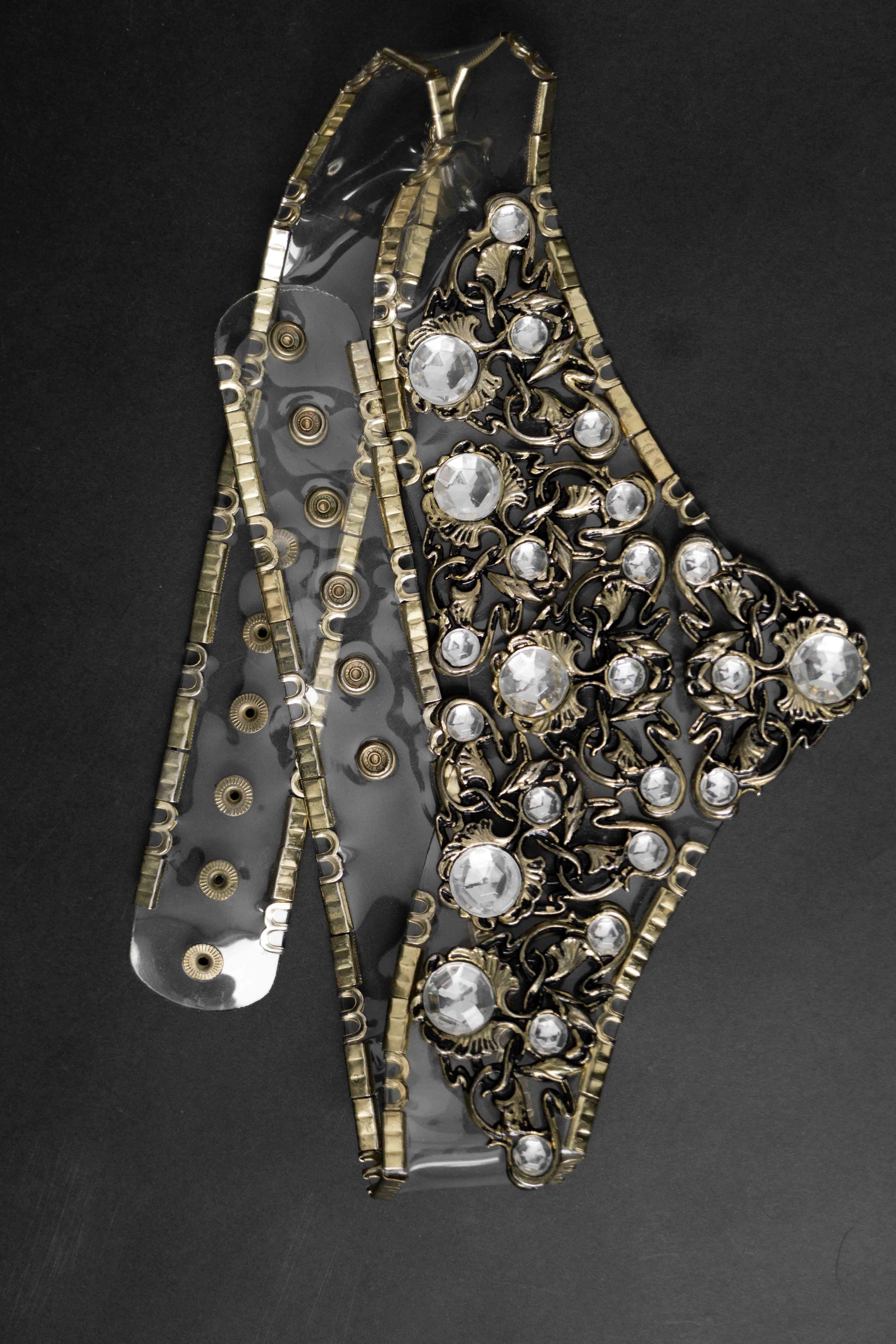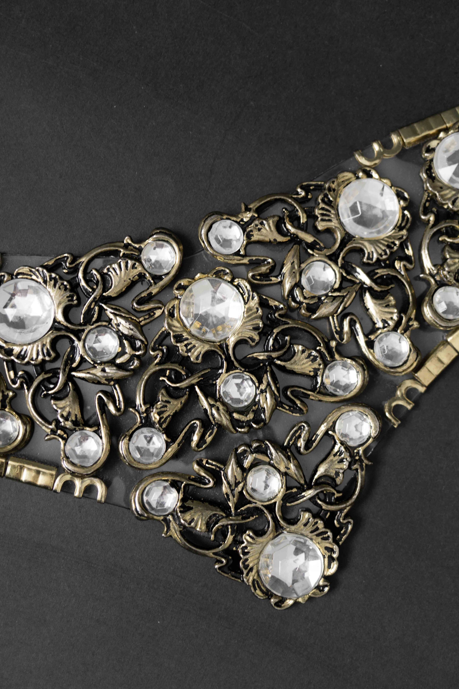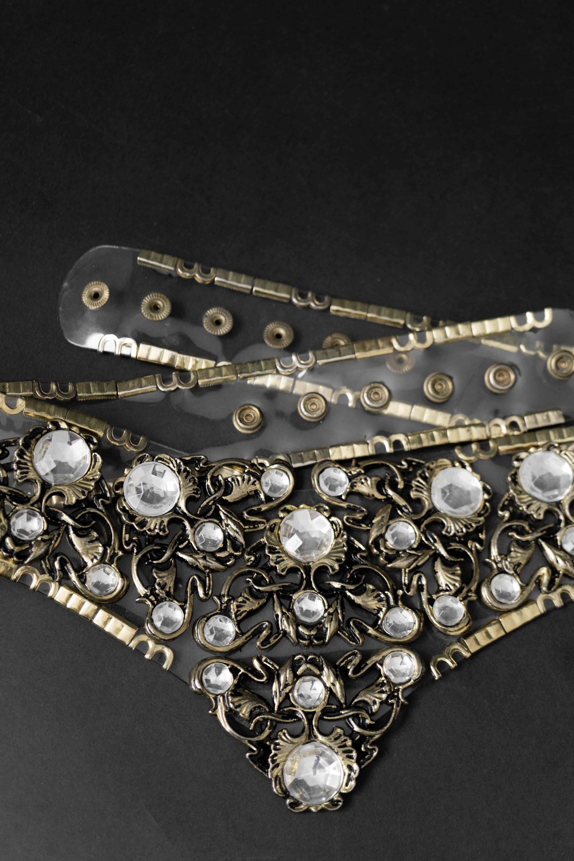 Dieser außergewöhnliche Gürtel stammt aus den 80er Jahren und bringt Glamour pur: Transparenter PVC trifft auf goldene Metallverzierungen und große Strasssteine. Wird hinten mit Druckknöpfen geschlossen und ist ein echtes Highlight über Kleidern, Blusen oder Jacken. Ideal für individuelle Looks im Gothic Vintage Stil oder als Kontrast zu minimalistischer Kleidung.