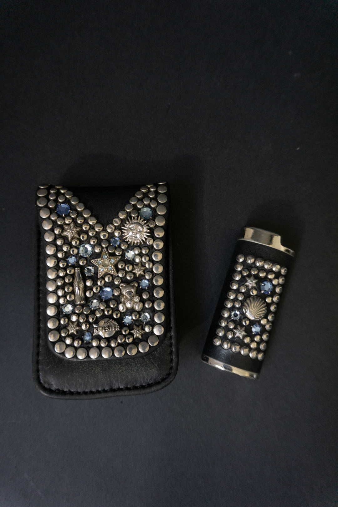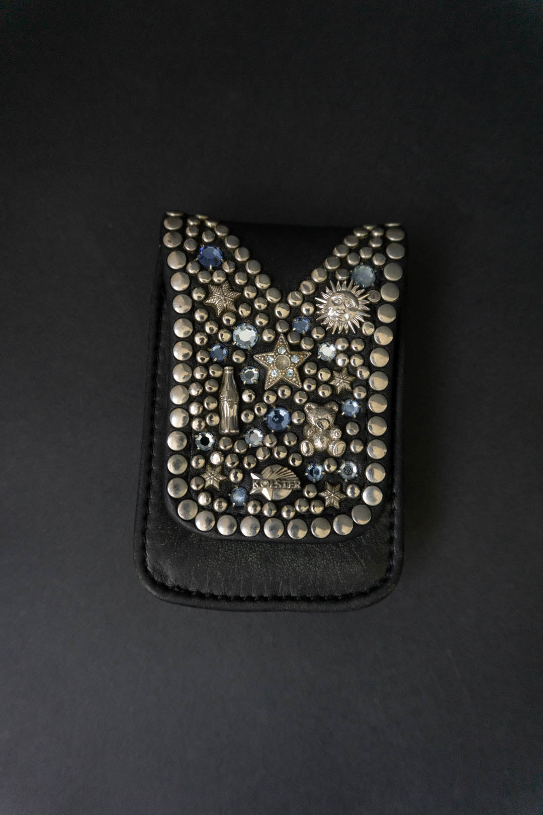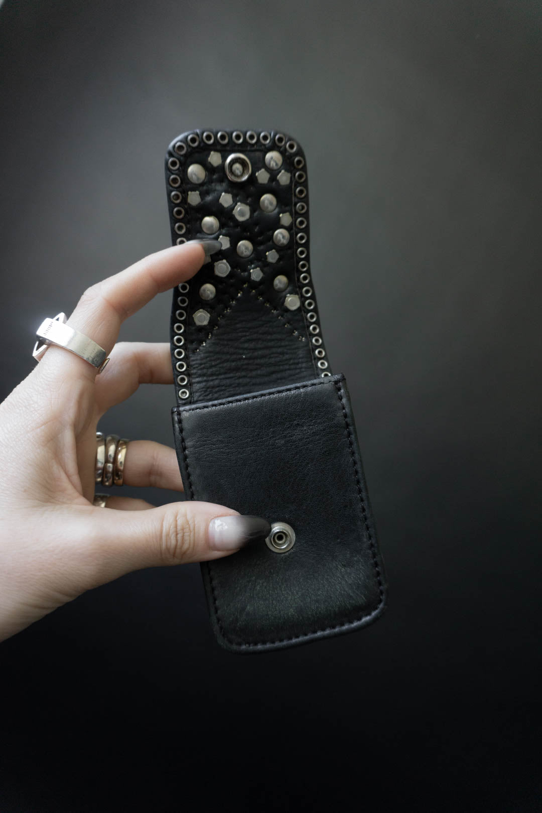 Kleines Lederetui aus den 80s. Handgefertigt und mit vielen Nieten und Strasssteinen verziert. Wird mit einem Druckknopf geschlossen und eignet sich perfekt als Zigarettenaufbewahrung oder als Case für Lippenstifte, Tampons oder andere Kleinigkeiten. Das passende Feuerzeug Case findet Ihr hier.