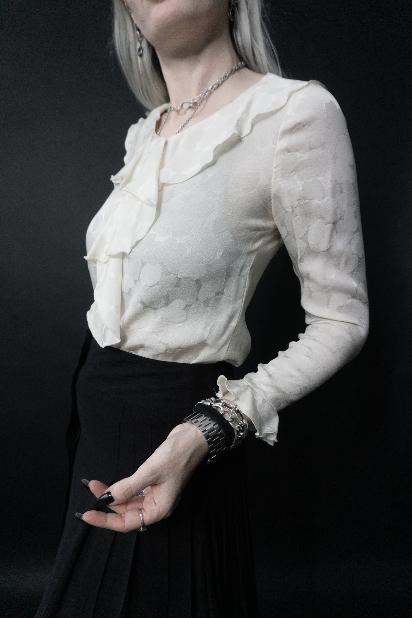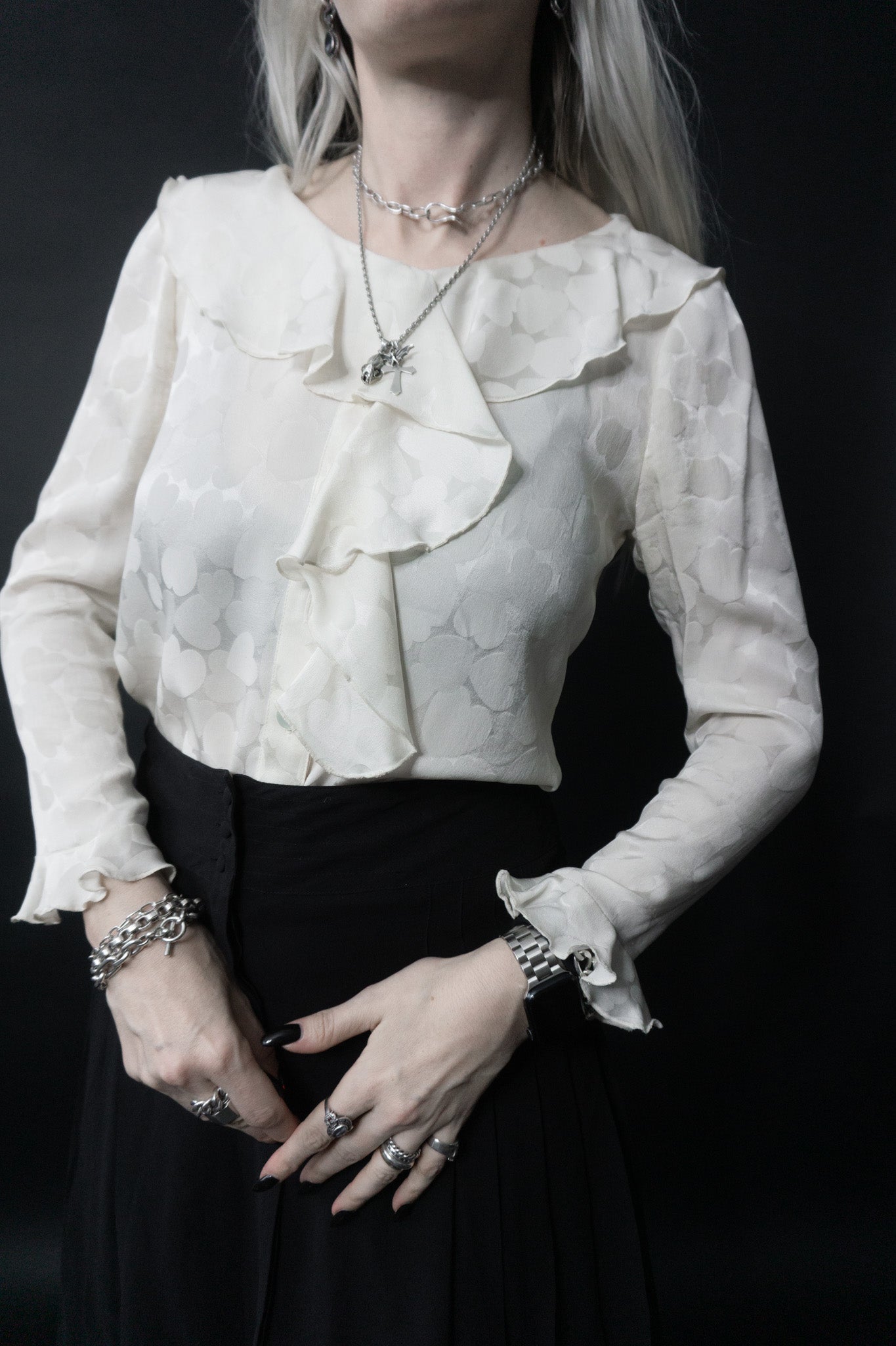Maßgeschneiderte Bluse aus reiner Seide. Ein absolutes Unikat. Vampire Volants für den perfekten Look. Ton in Ton Herz Muster (errinert an Viktor & Rolf). Unter den Armen leichte Gebrauchsspuren, fällt kaum auf.