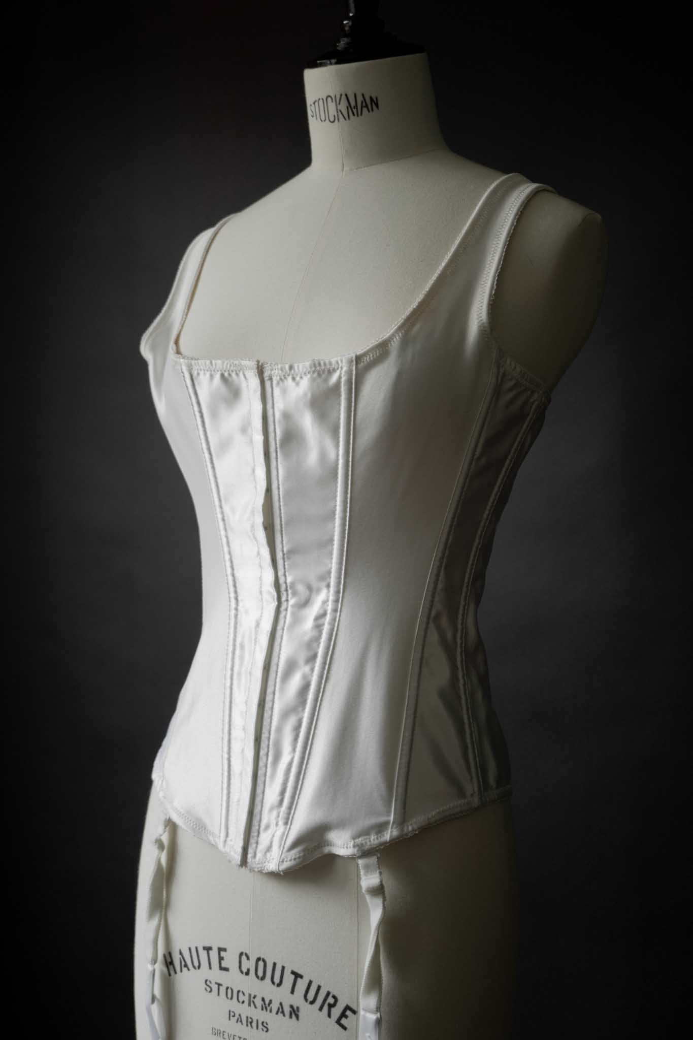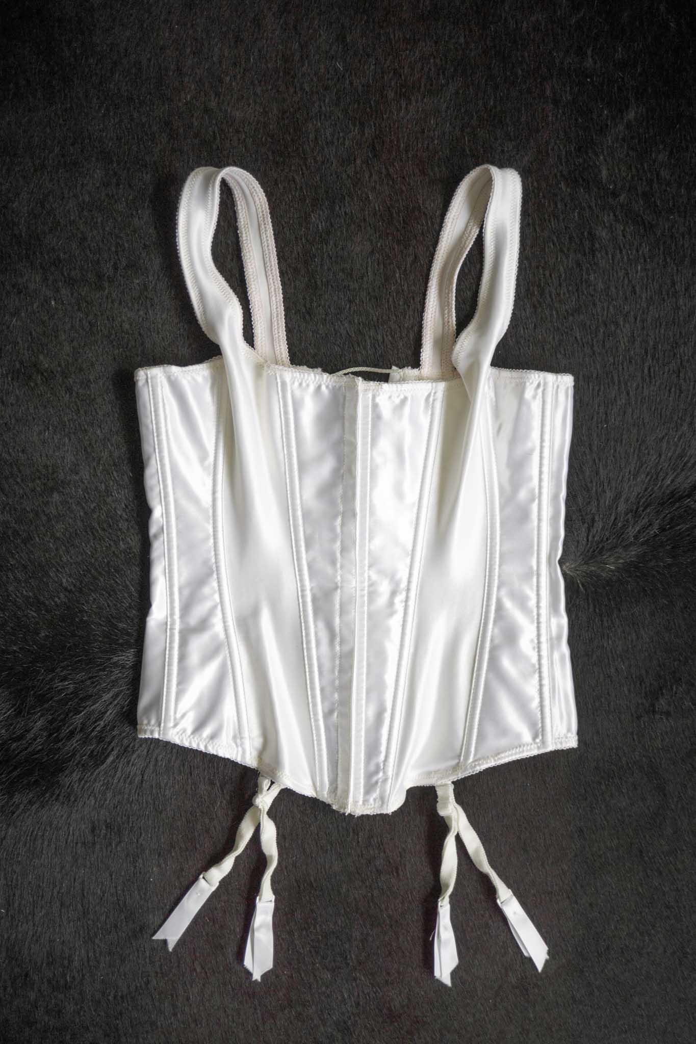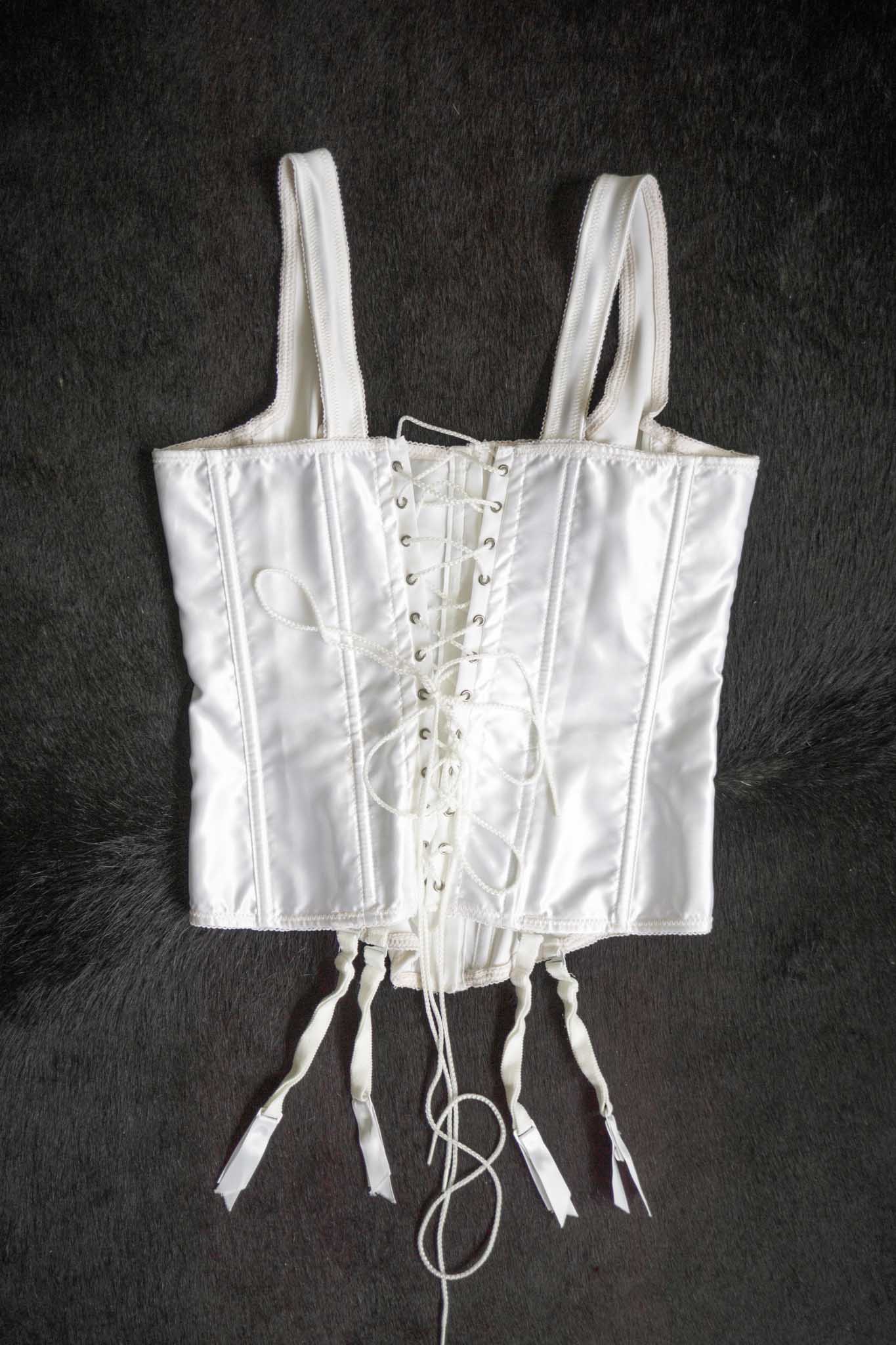 Diese weiße Corsage aus Satin stammt von Frederick’s of Hollywood (90er Jahre) und lässt Vintage-Herzen höherschlagen. Mit rückseitiger Schnürung, Strumpfhaltern und figurnaher Silhouette ist sie ein Highlight für Boudoir oder Bühne.