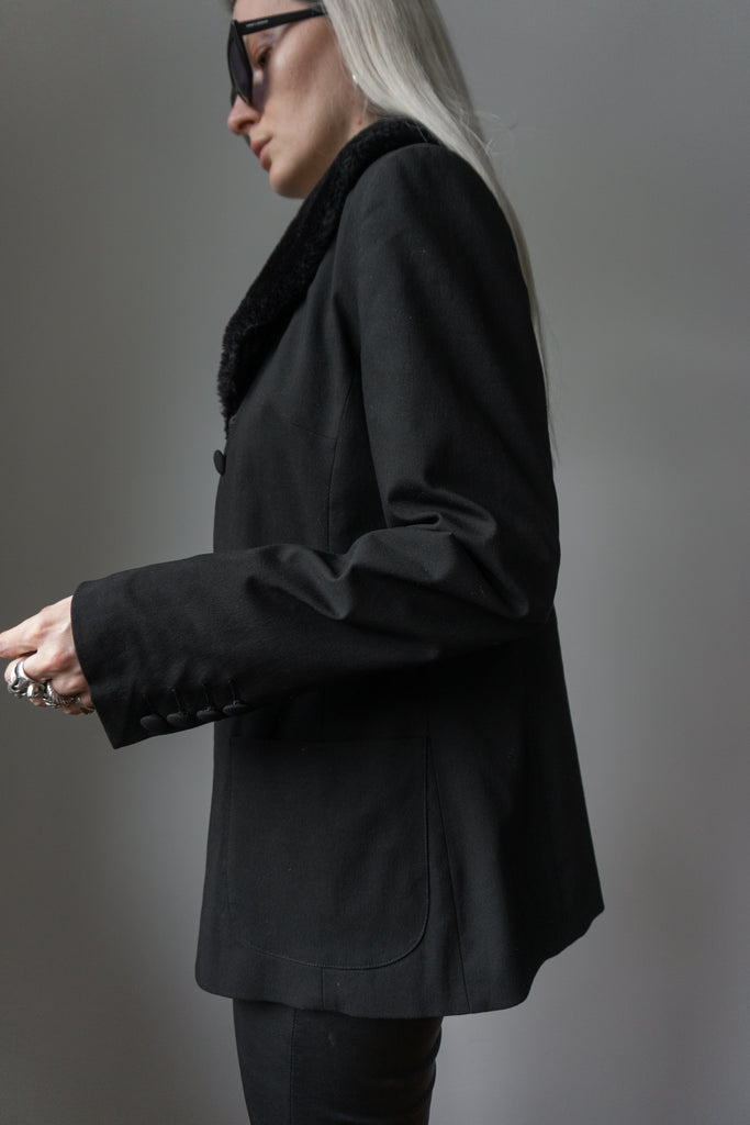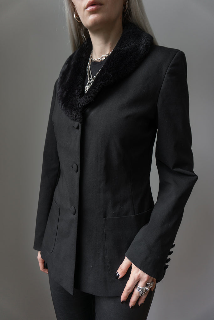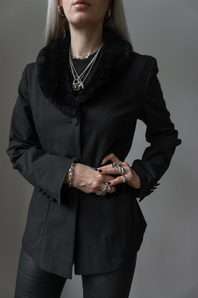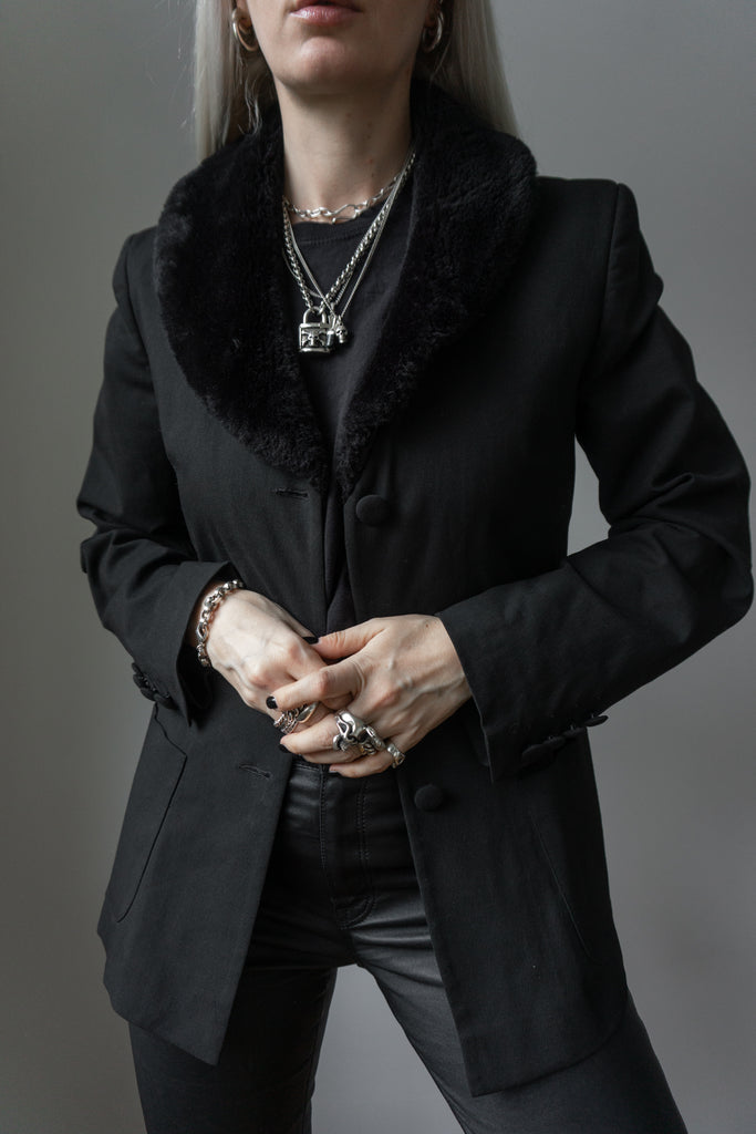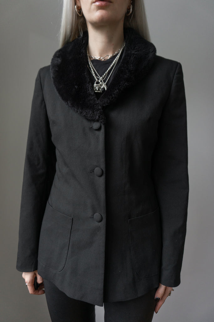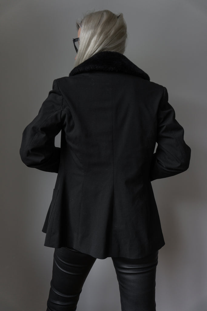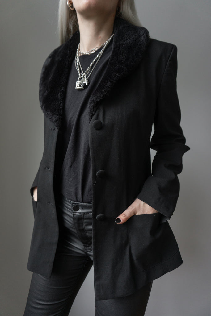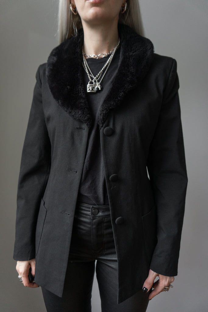 Schwarze Blazer mit Fake Fur Kragen und aufgesetzten Taschen.