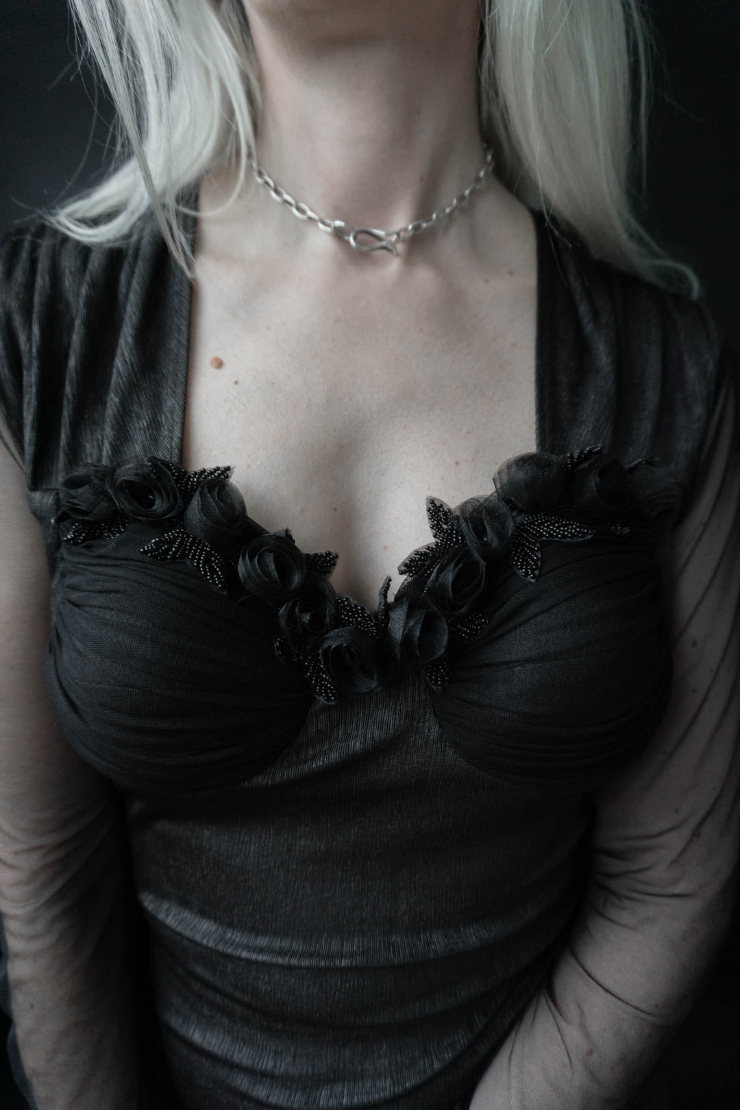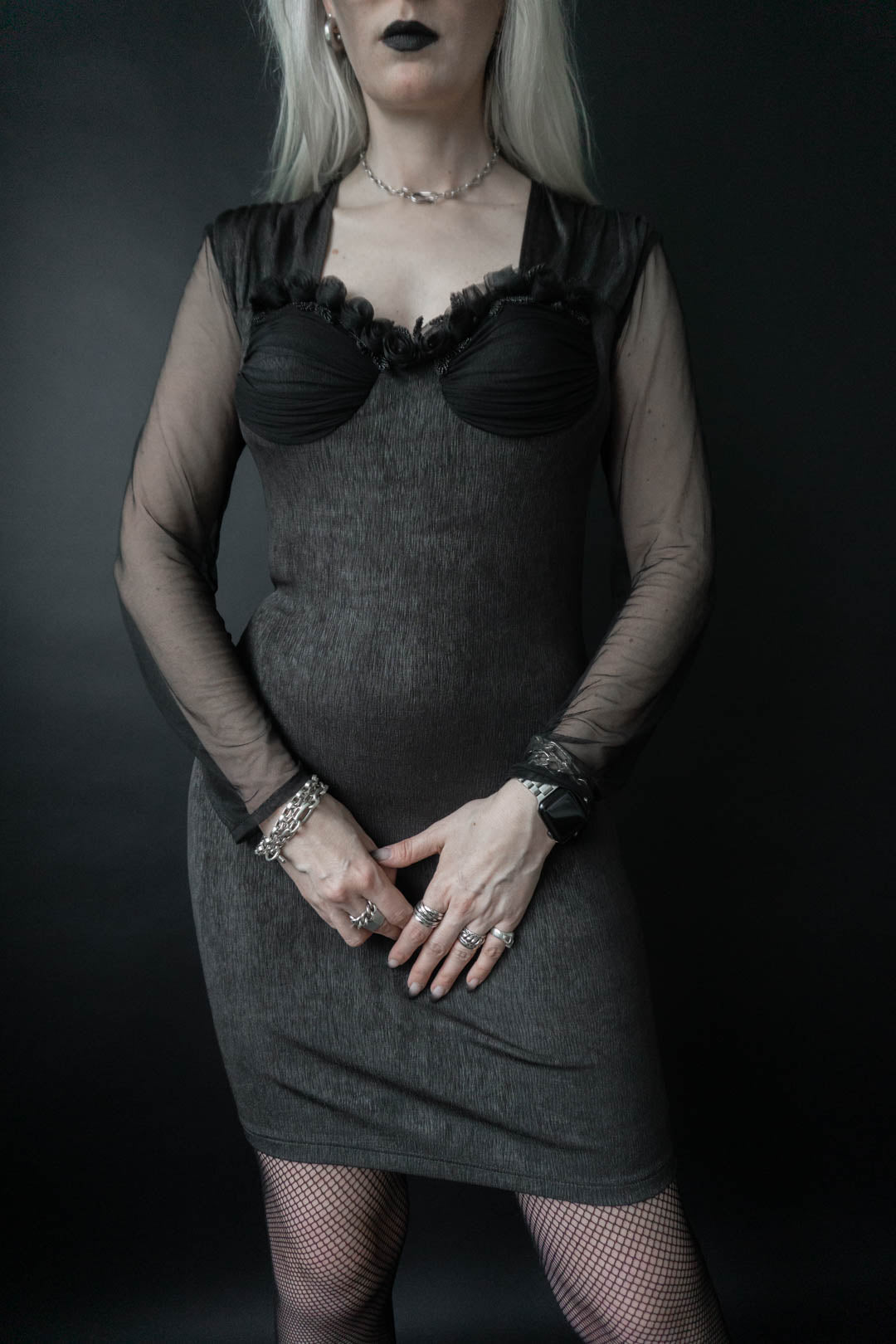 Hübsches Gothic Minikleid aus elastischem Material. Oberteil als Bustier gearbeitet und transparente Ärmel. Wird hinten mit einem Reißverschluss geschlossen.