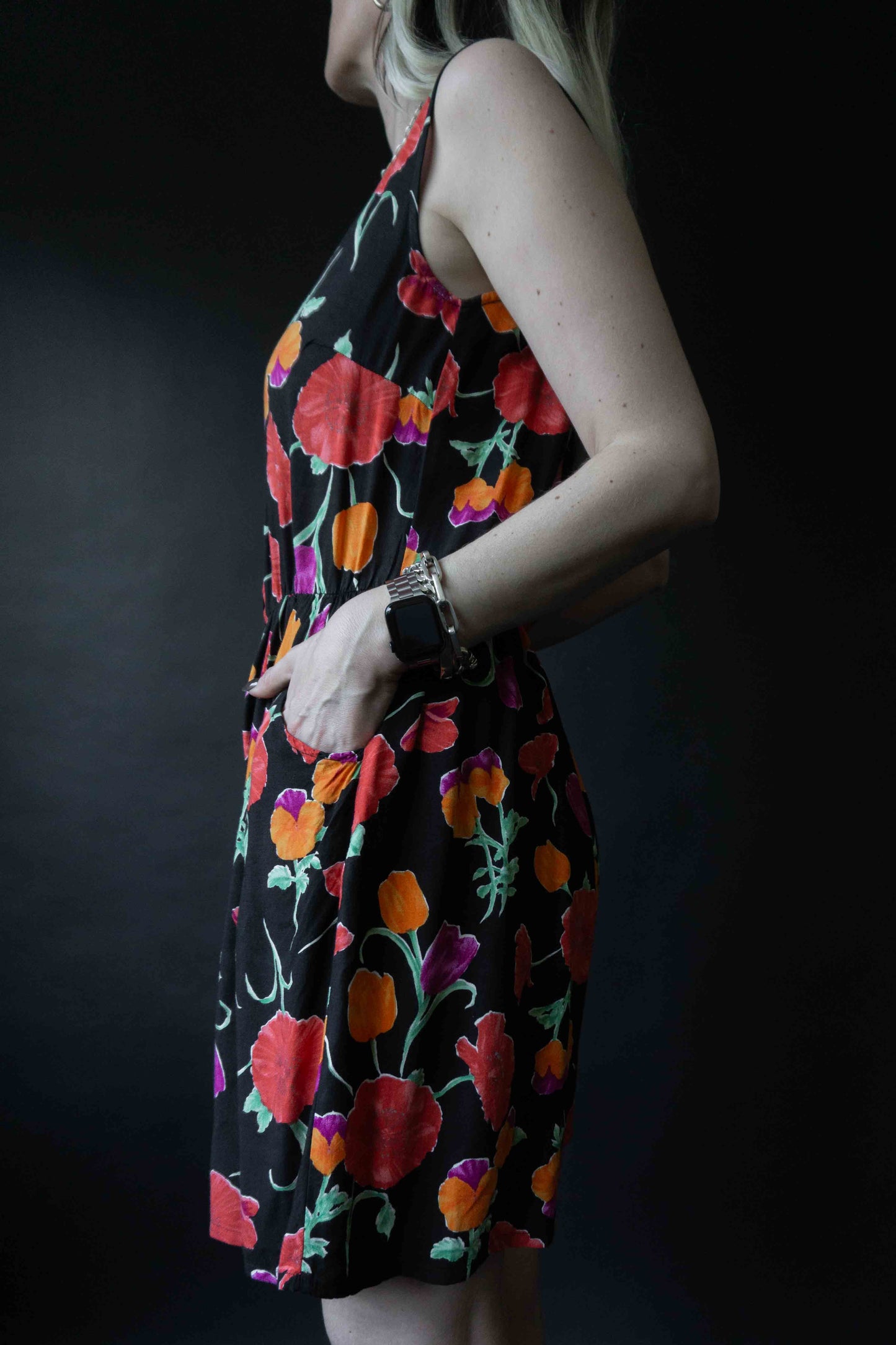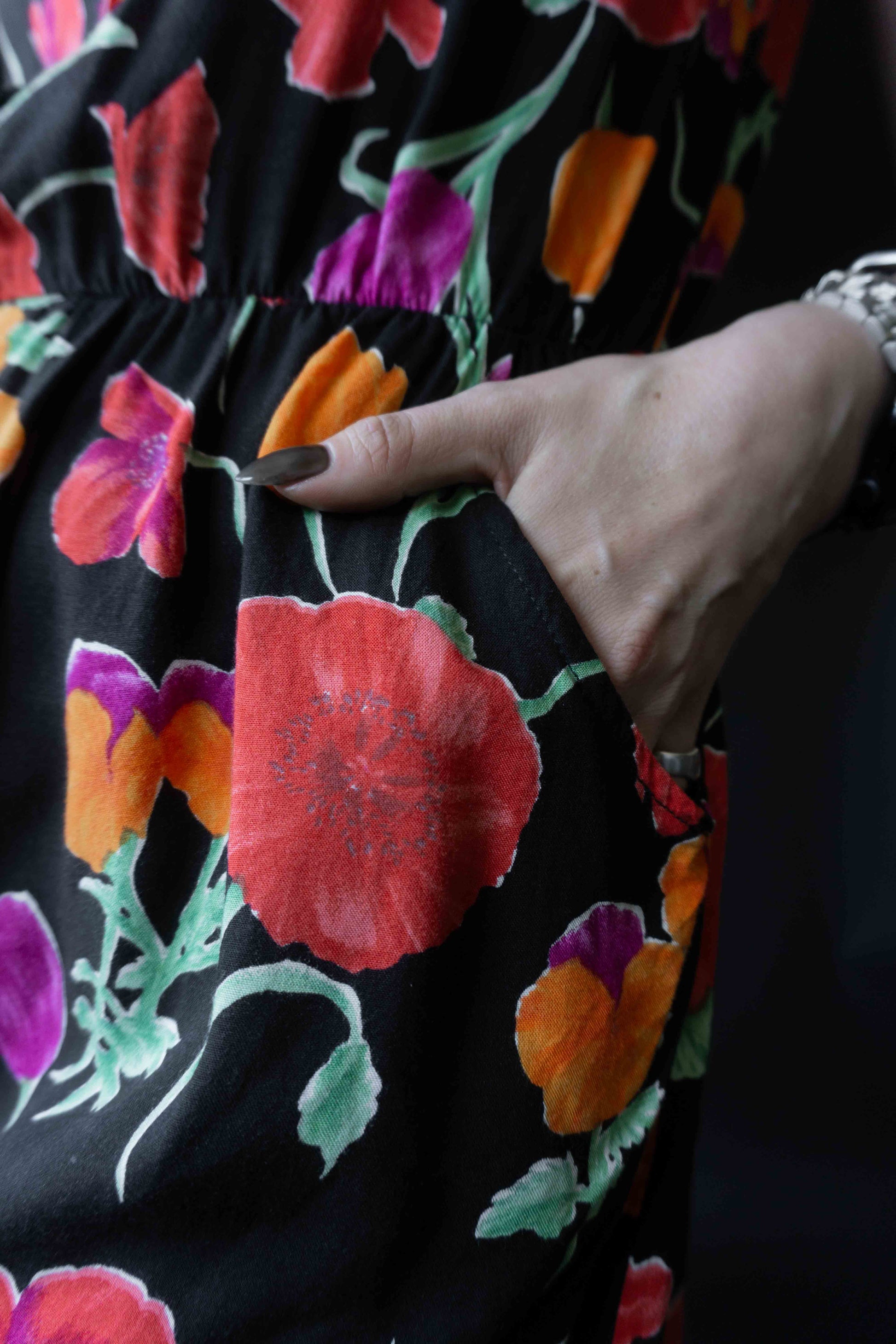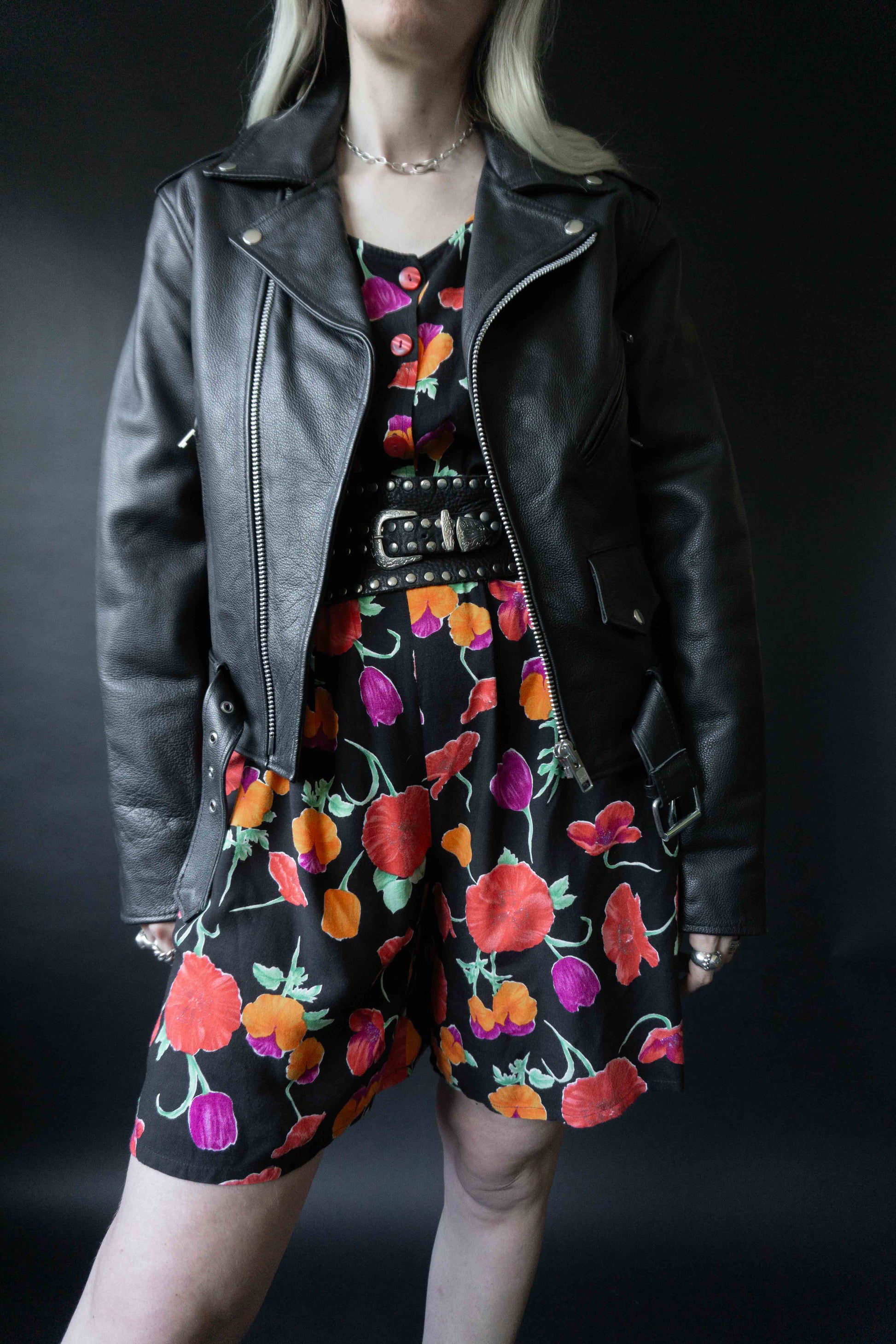 Dieser schulterfreie Jumpsuit aus Viskose kombiniert Leichtigkeit mit romantischem Charme. Schwarzer Grund, zartes Blütenmuster, kleine Knopfleiste vorn und seitliche Einschubtaschen. Das Material fällt weich und ist super angenehm auf der Haut – ideal für Sommernächte oder als verspieltes Layering-Piece. Die kombinierten Teile findet ihr hier: Biker Lederjacke, Westerngürtel, Bomberjacke.