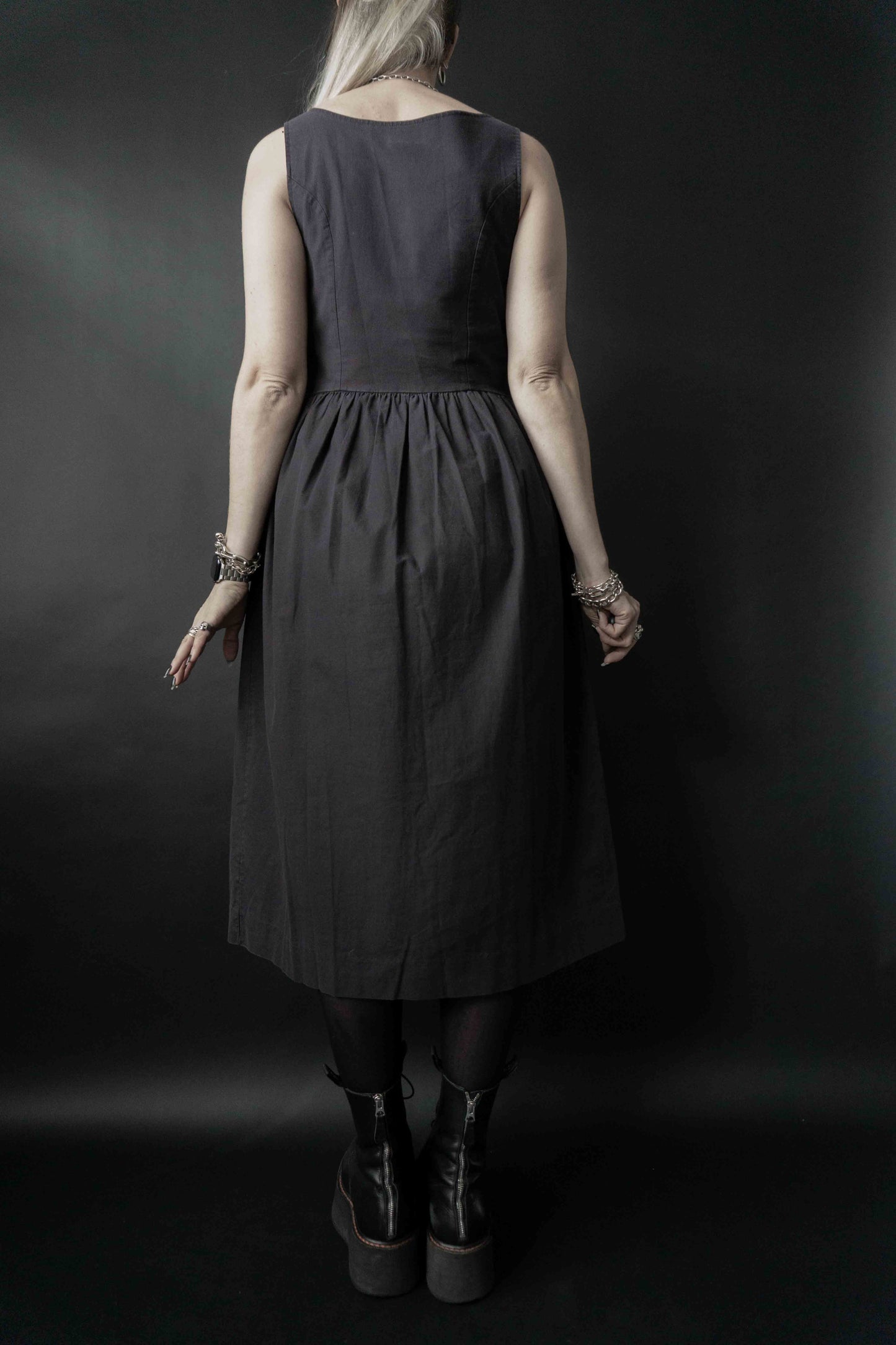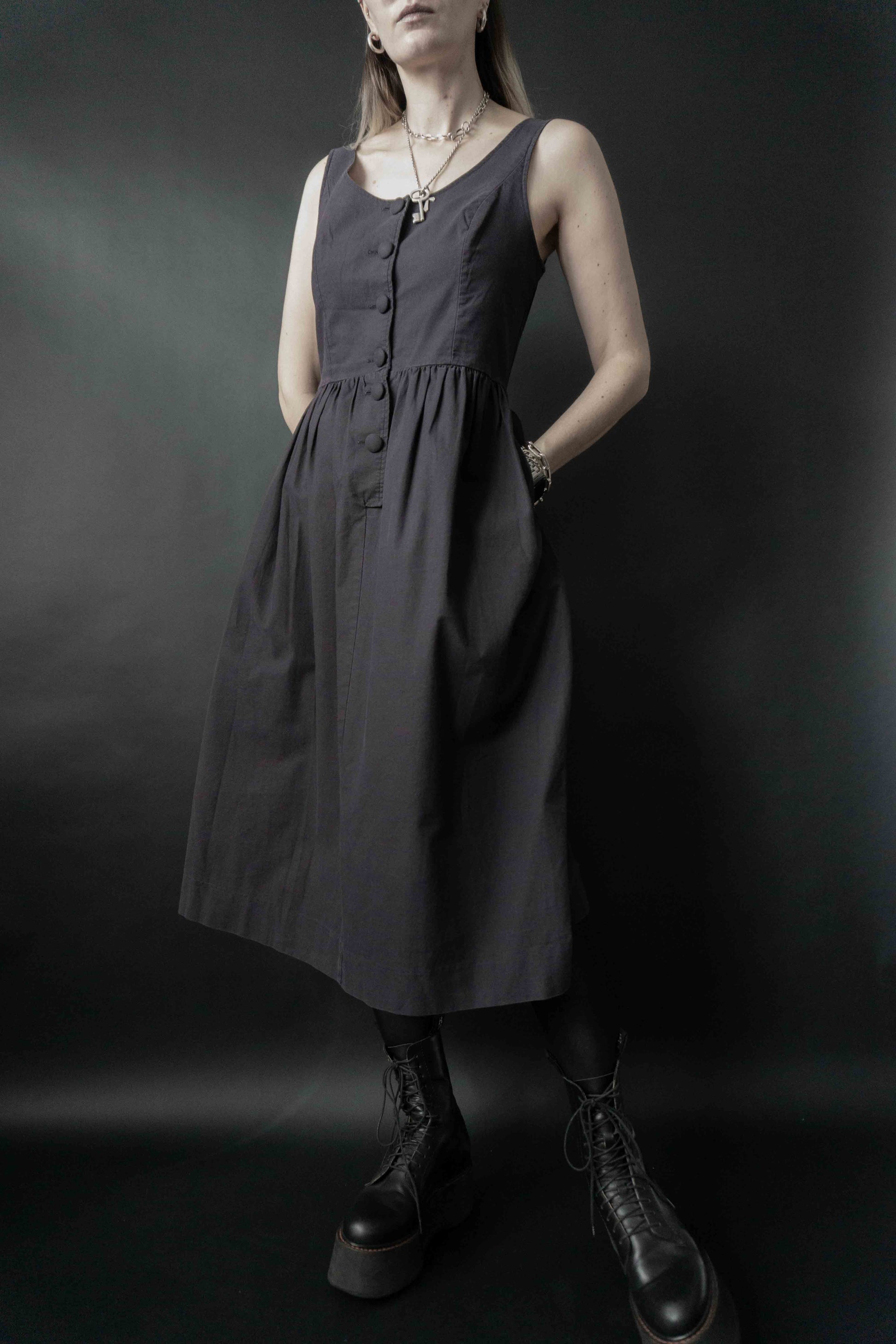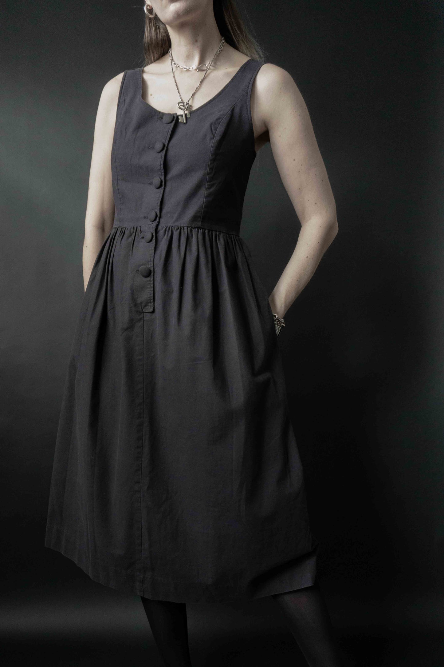 Dieses Vintage-Kleid von Laura Ashley aus den 90ern ist ein wahres Must-have für Liebhaber:innen dunkler Sommerlooks. Aus hochwertiger Baumwolle gefertigt, bietet es eine leichte Struktur und optimale Atmungsaktivität. Details wie die durchgehende Knopfleiste, seitliche Taschen und die schlichte A-Linie machen es zum perfekten Gothic-Sommerkleid.