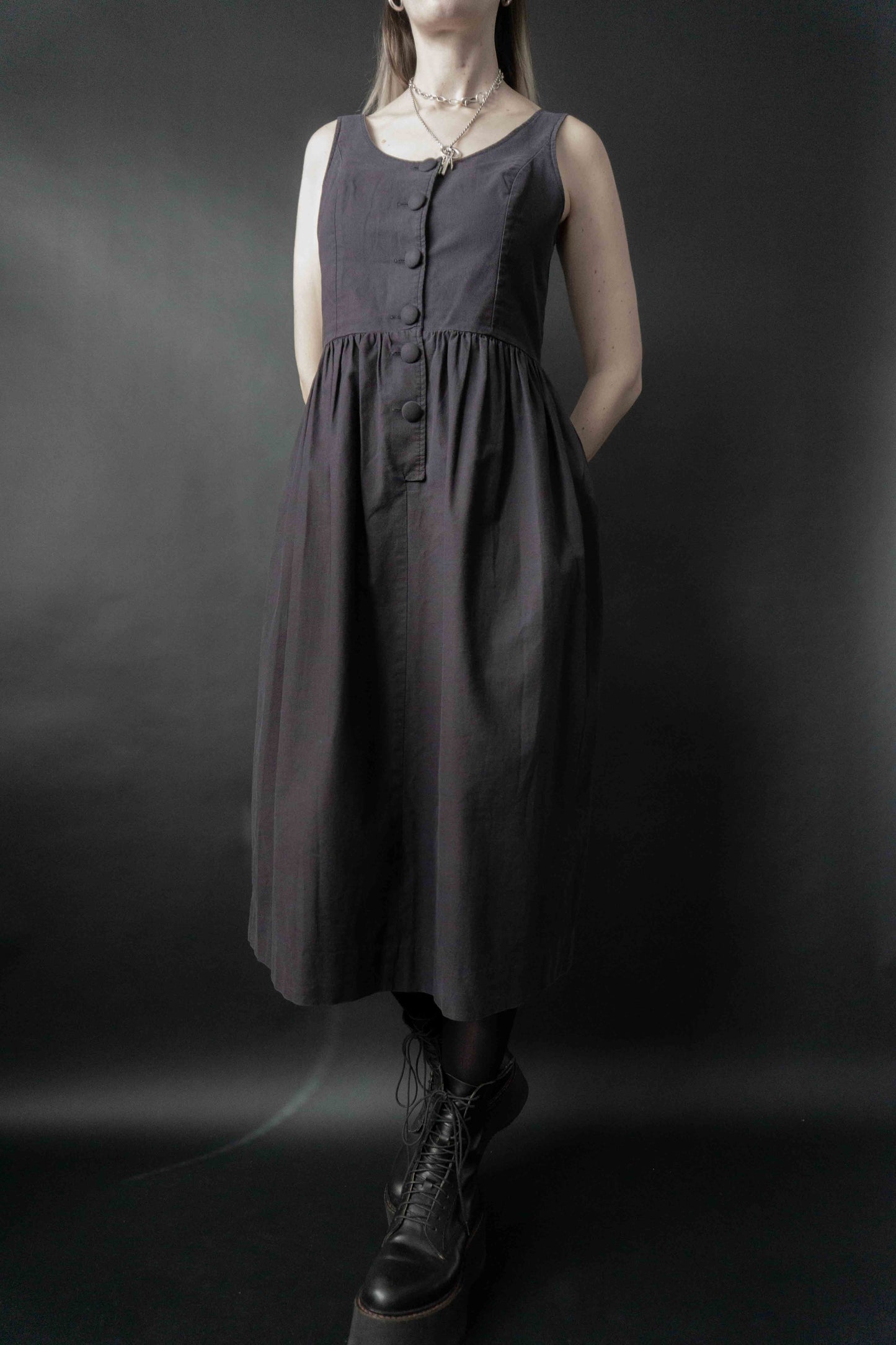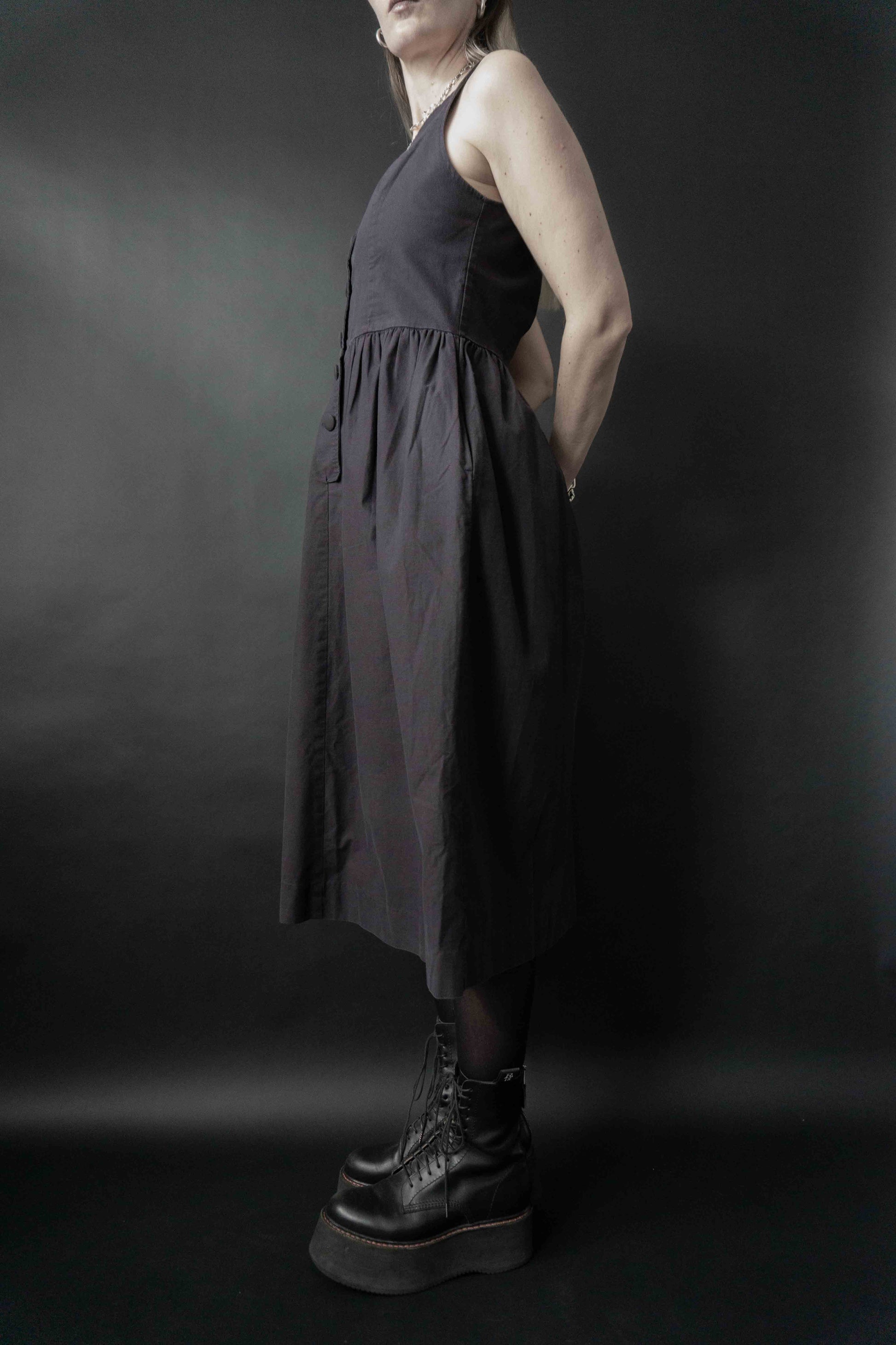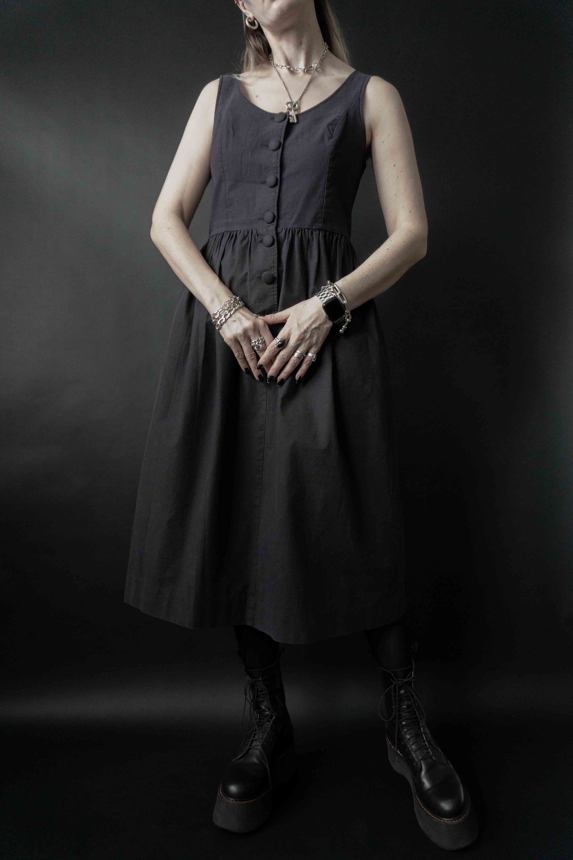 Dieses Vintage-Kleid von Laura Ashley aus den 90ern ist ein wahres Must-have für Liebhaber:innen dunkler Sommerlooks. Aus hochwertiger Baumwolle gefertigt, bietet es eine leichte Struktur und optimale Atmungsaktivität. Details wie die durchgehende Knopfleiste, seitliche Taschen und die schlichte A-Linie machen es zum perfekten Gothic-Sommerkleid.