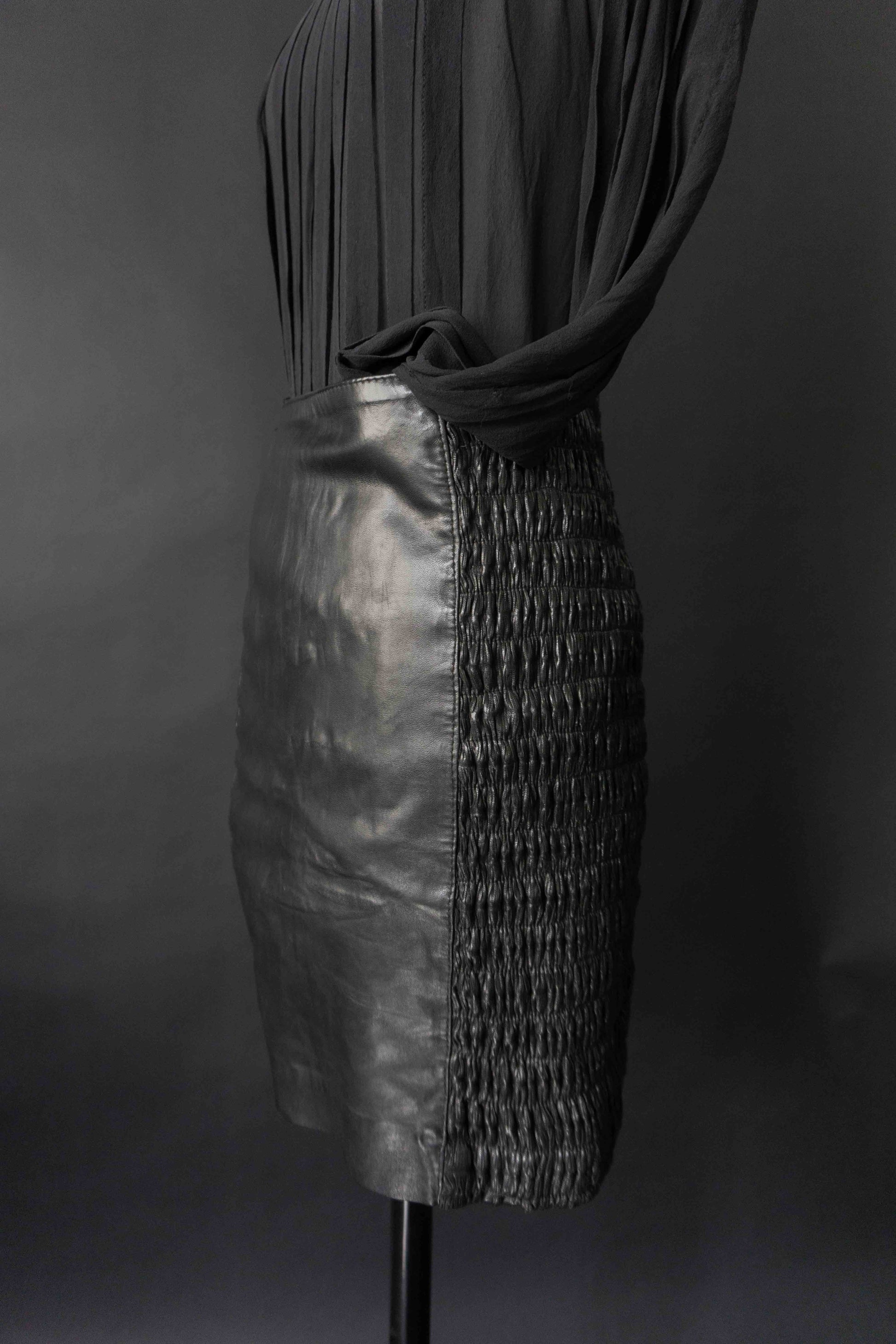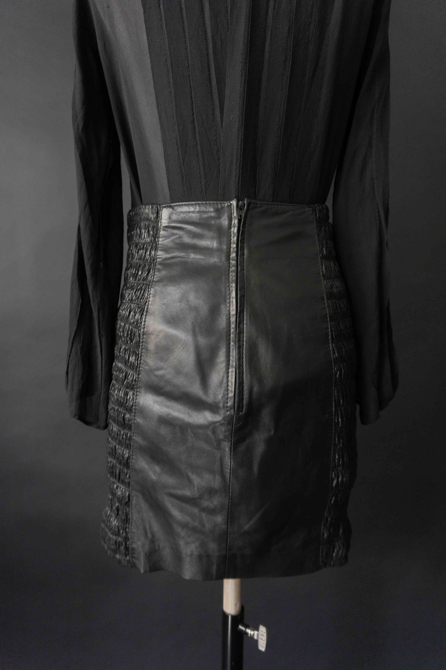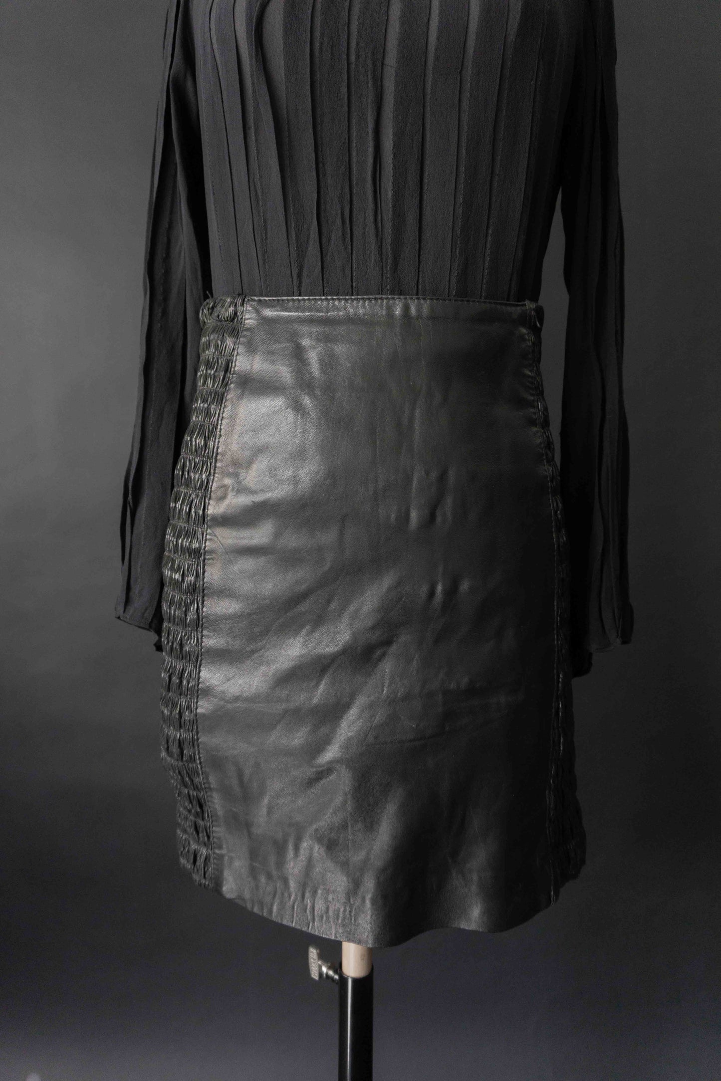 Dieser schwarze Lederrock in Mini-Länge überzeugt durch seitliche Raffdetails und einen figurbetonten Sitz. Die seitlichen Partien sind leicht elastisch, was für ein bequemes Tragegefühl sorgt. Hinten mit Reißverschluss. Am Bund zeigen sich kleine Gebrauchsspuren, bei denen sich das Leder etwas löst – im getragenen Zustand kaum sichtbar. Deshalb zum günstigen Preis. Für Liebhaber*innen von authentischem Vintage mit Charakter.
