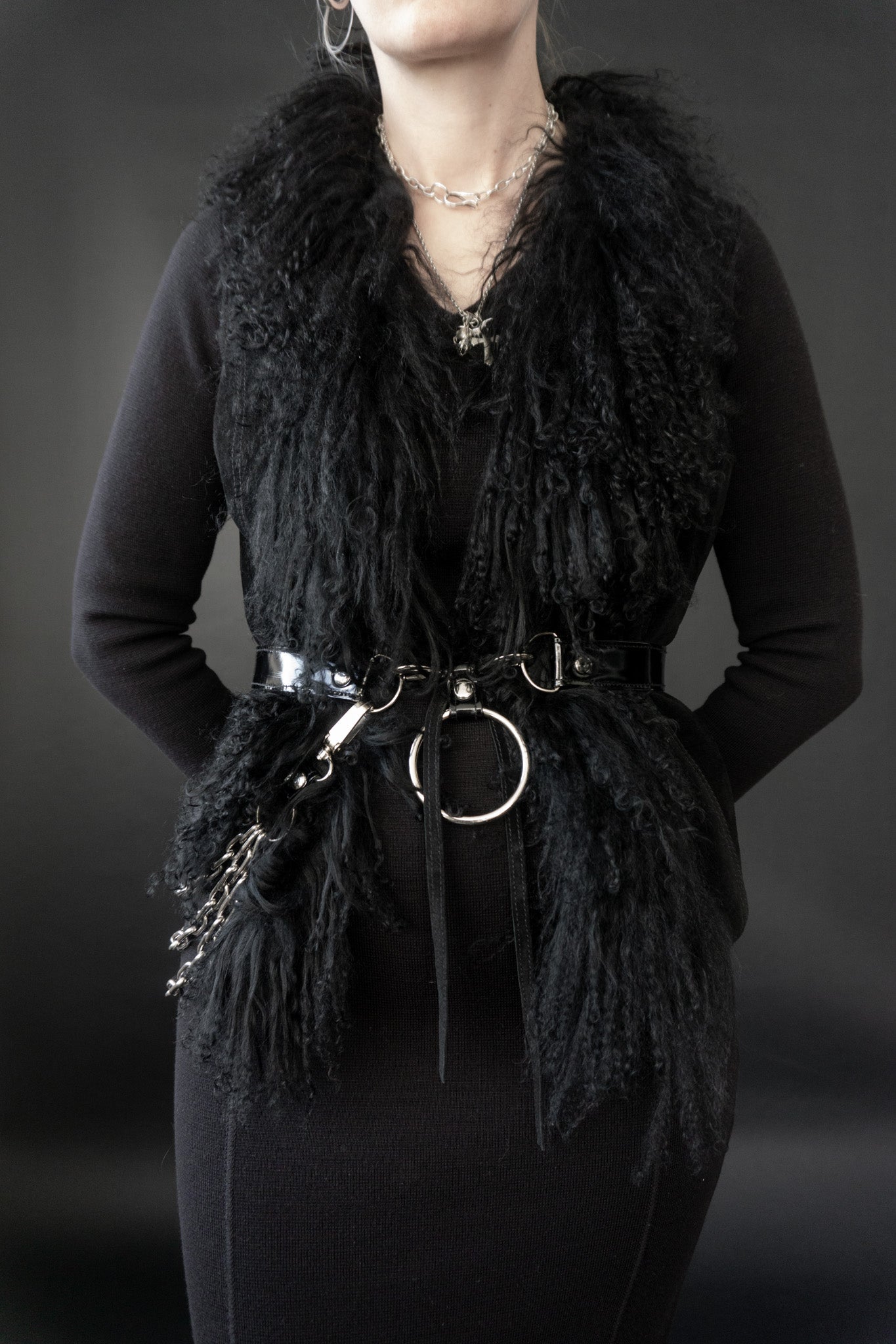 Layering Grail! Echtlederweste mit Shearling Kragen. Perfektes Layeringteil um schlichte Outfits sofort besonders zu machen. Kann mit einer Schnur aus Leder zugebunden werden. Der Gürtel dient nur der Inspiration und gehört nicht dazu.
