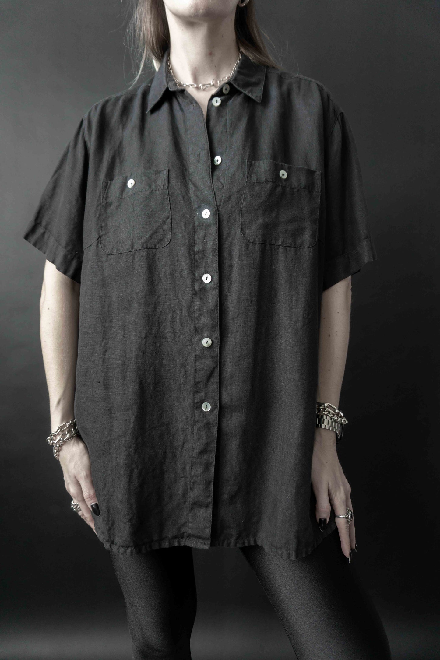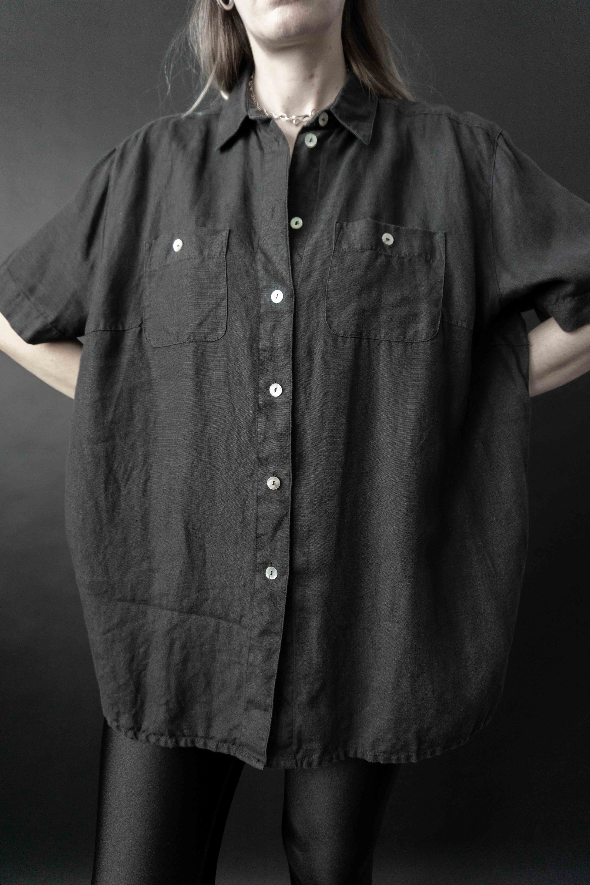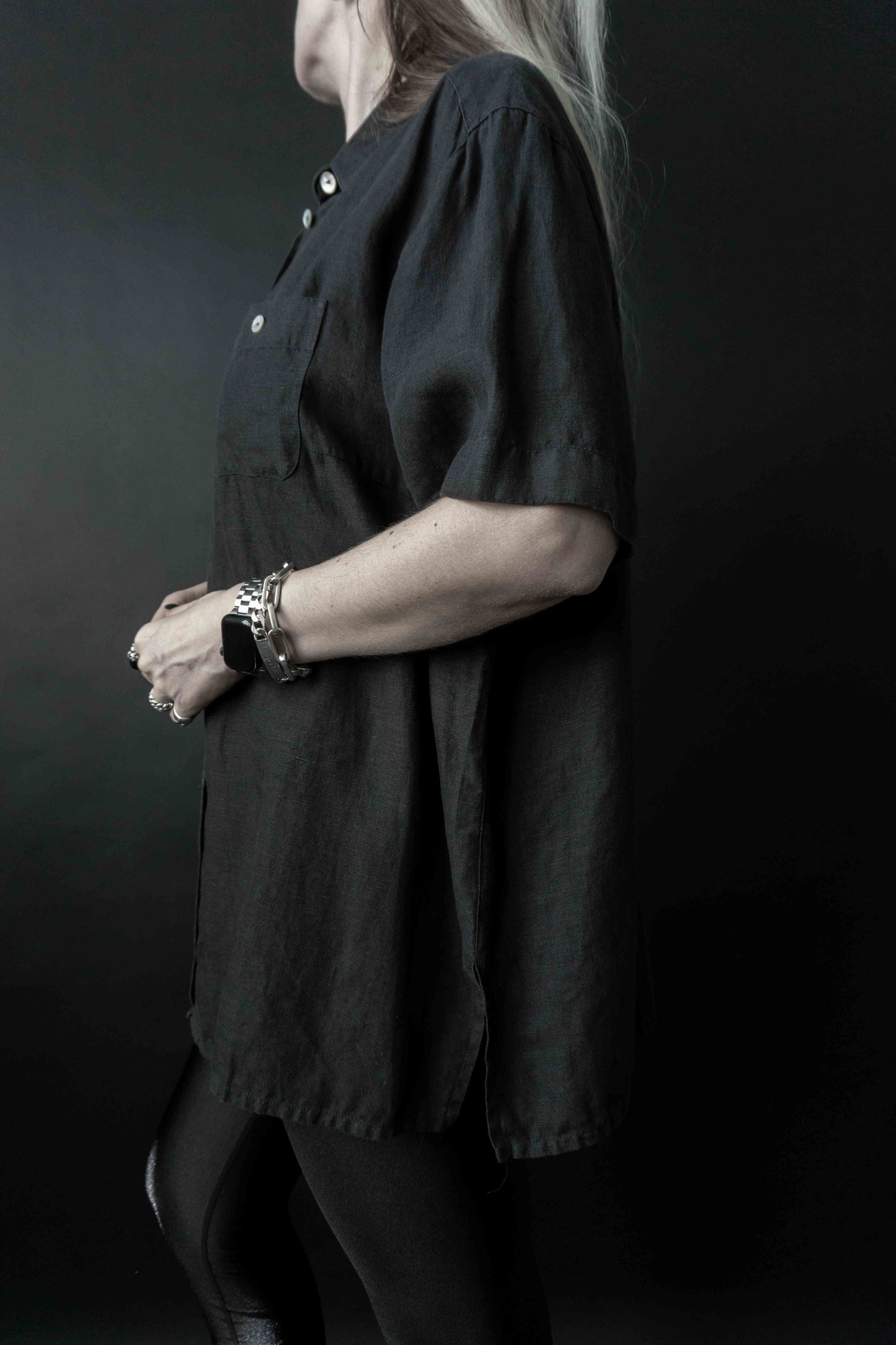 Leichte Leinenbluse mit kurzen Ärmeln, aufgesetzten Brusttaschen und hochwertigen Perlmuttknöpfen. Kleine Schlitze an den Seiten sorgen für extra Bewegungsfreiheit – perfekt für warme Tage.