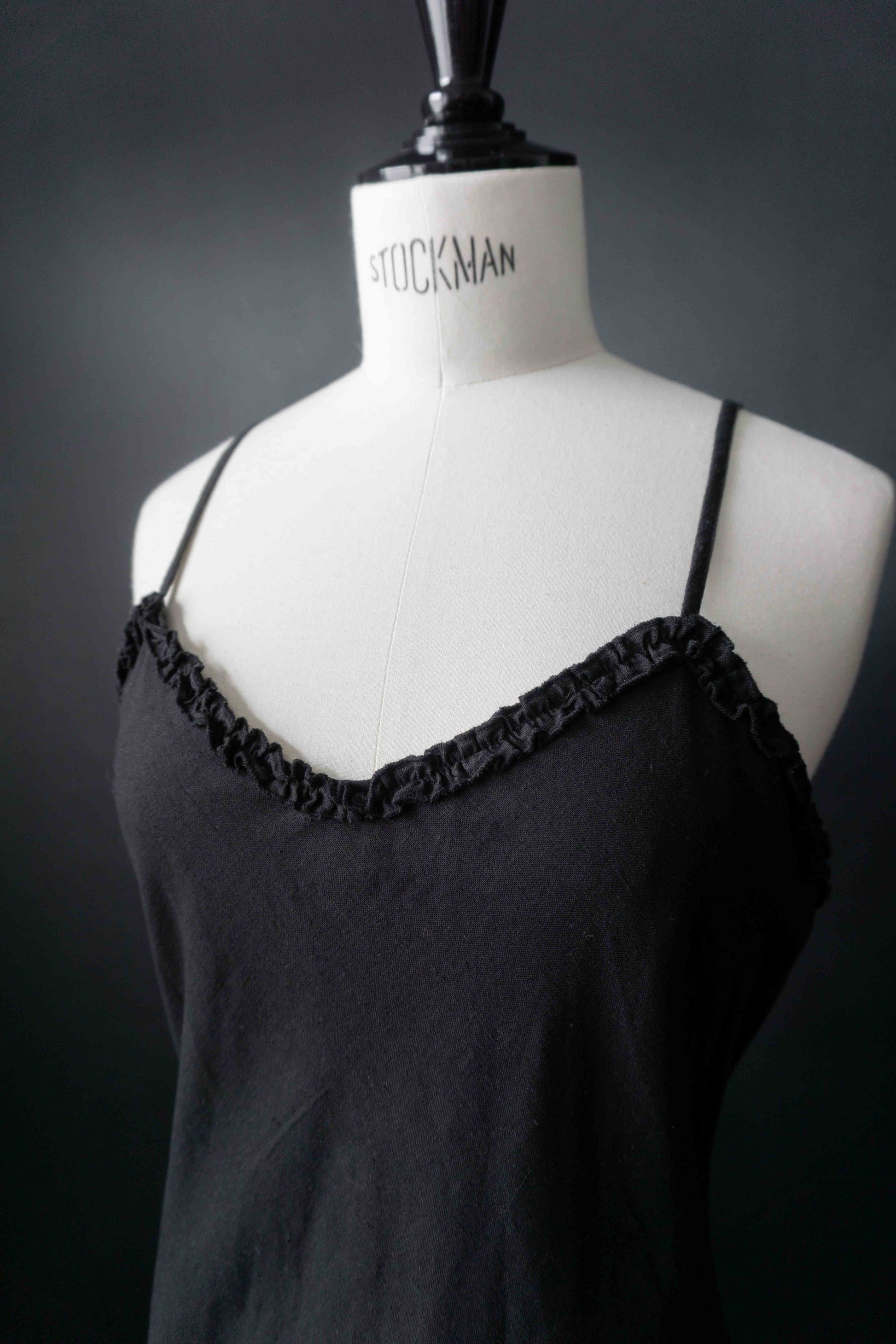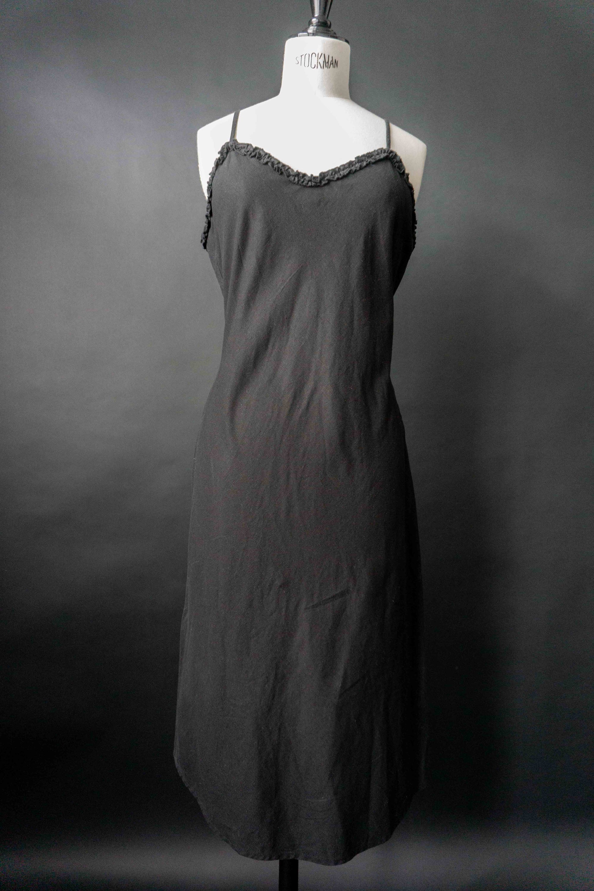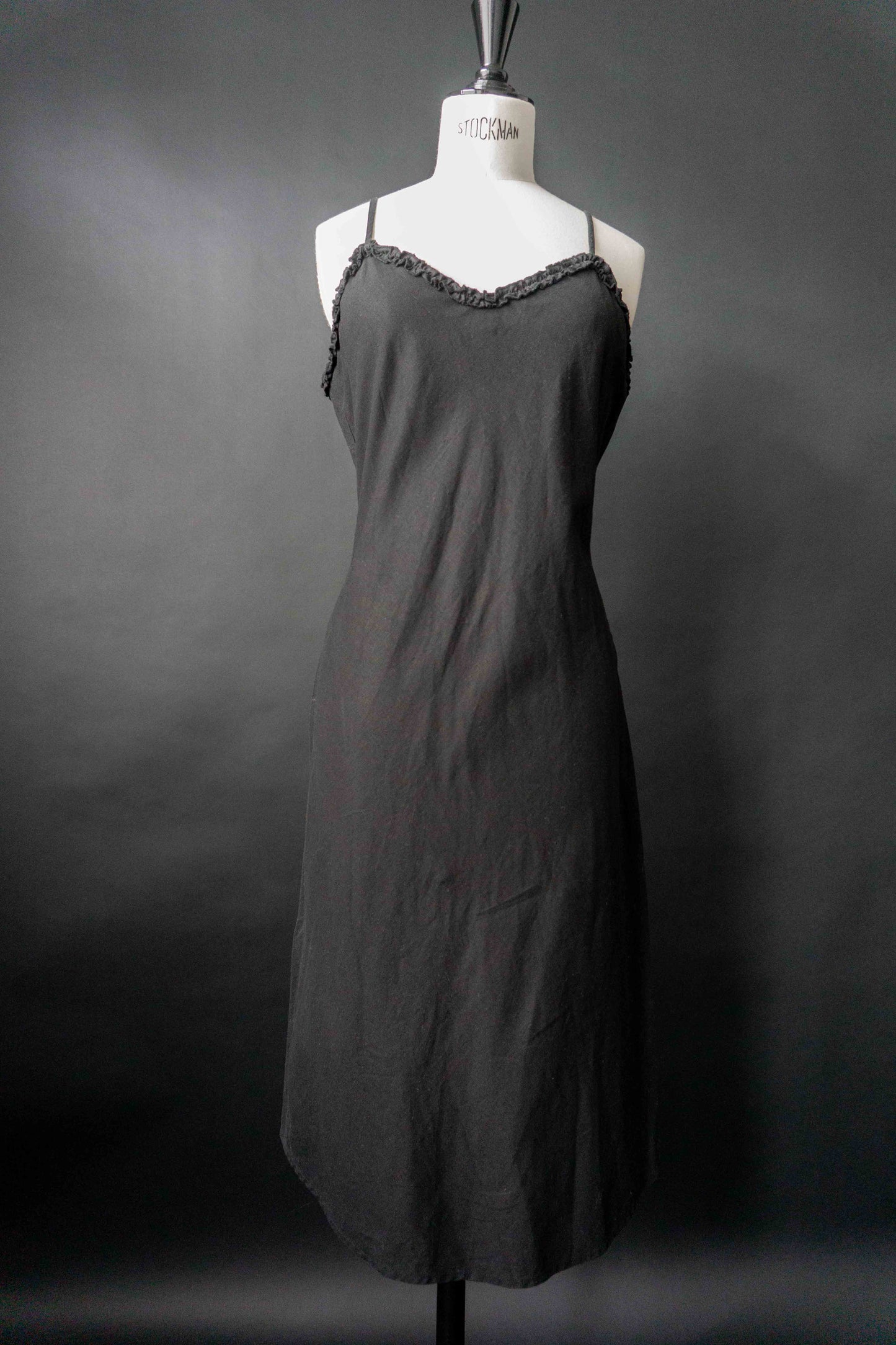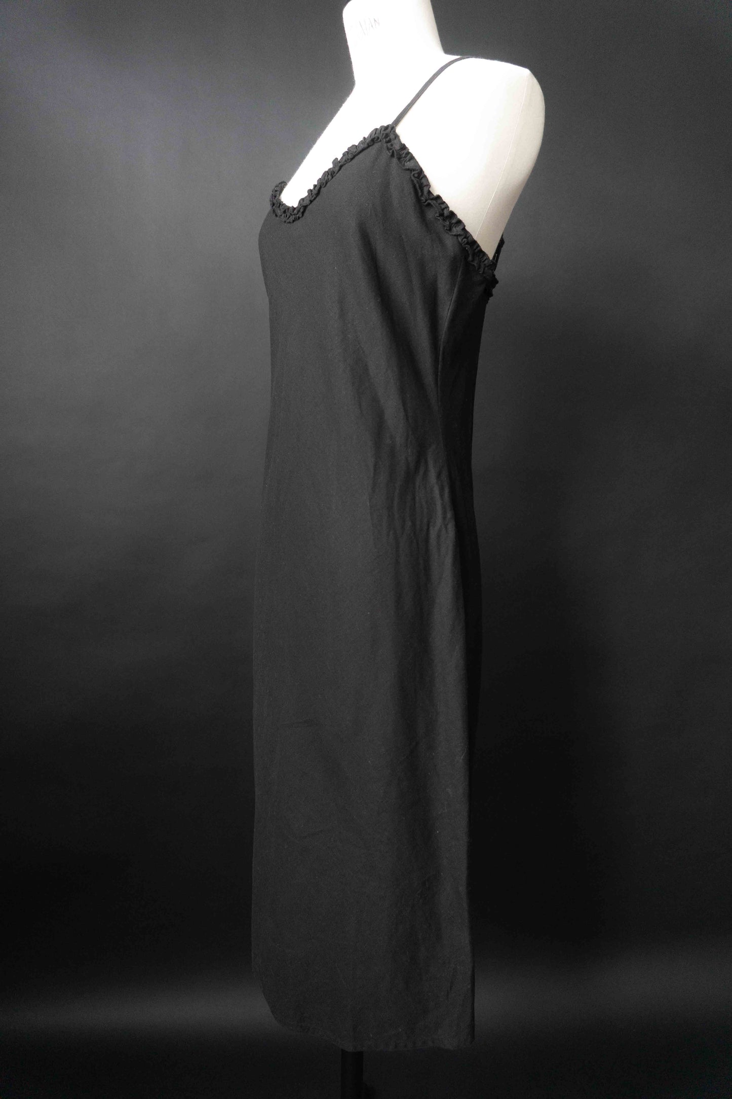 Schwarzes Vintage Kleid aus Leinen, schmal geschnitten mit süßer Rüschenkante am Ausschnitt. Hinten mit Reißverschluss – ideal für heiße Sommertage im Witch- oder Cottagecore-Stil.