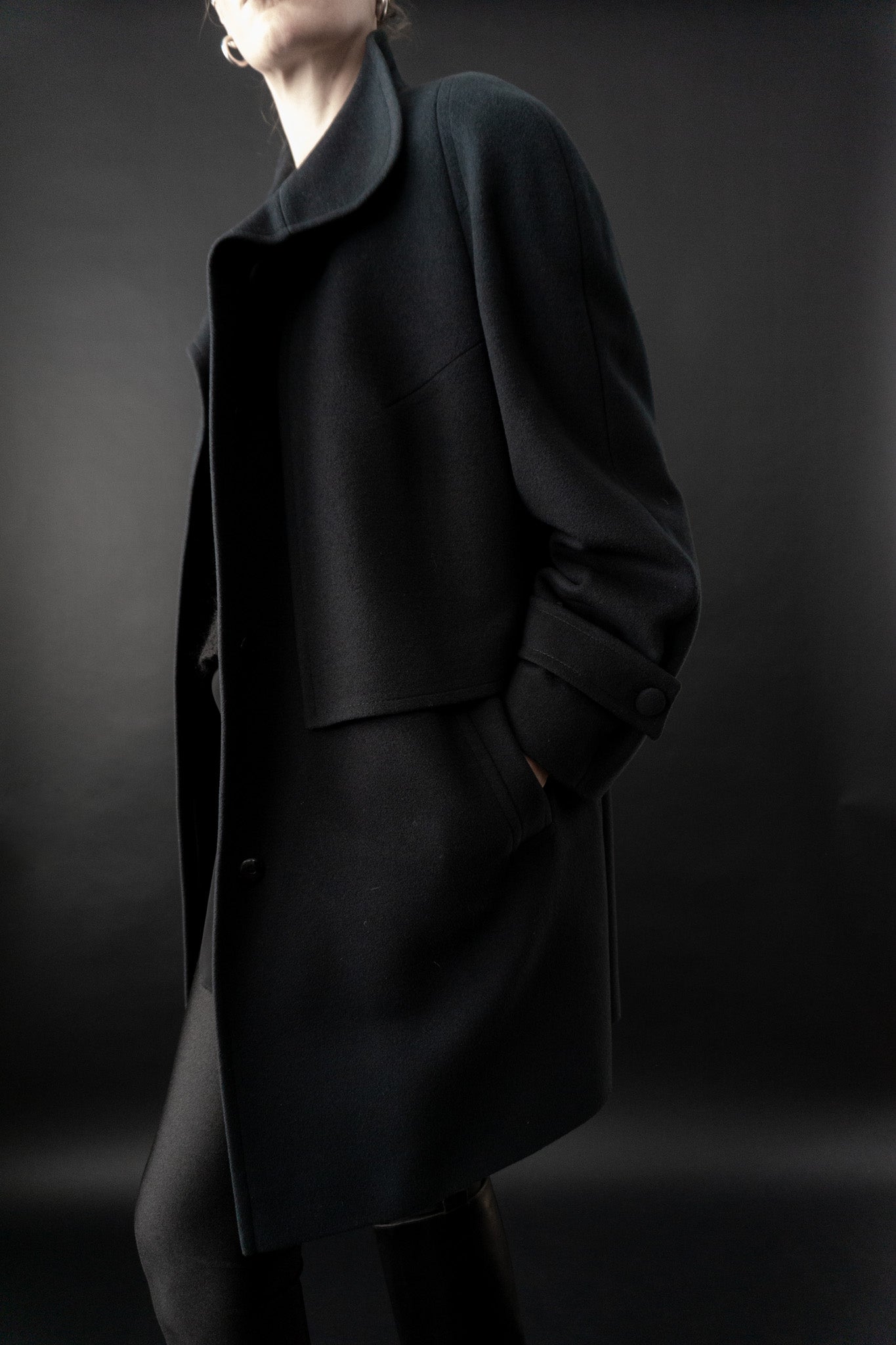 Dieser edle Wollmantel in tiefem, dunklem Petrol verkörpert Ästhetik, dunkle Eleganz, hochwertige Materialien und zeitlose Zurückhaltung. Mit seiner exklusiven Materialkomposition aus 90% Schurwolle und 10% Cashmere bietet er eine unvergleichlich weiche Haptik und eine angenehm leichte, aber dennoch warme Struktur – ein echtes Highlight für Liebhaber*innen hochwertiger Vintage Mode.