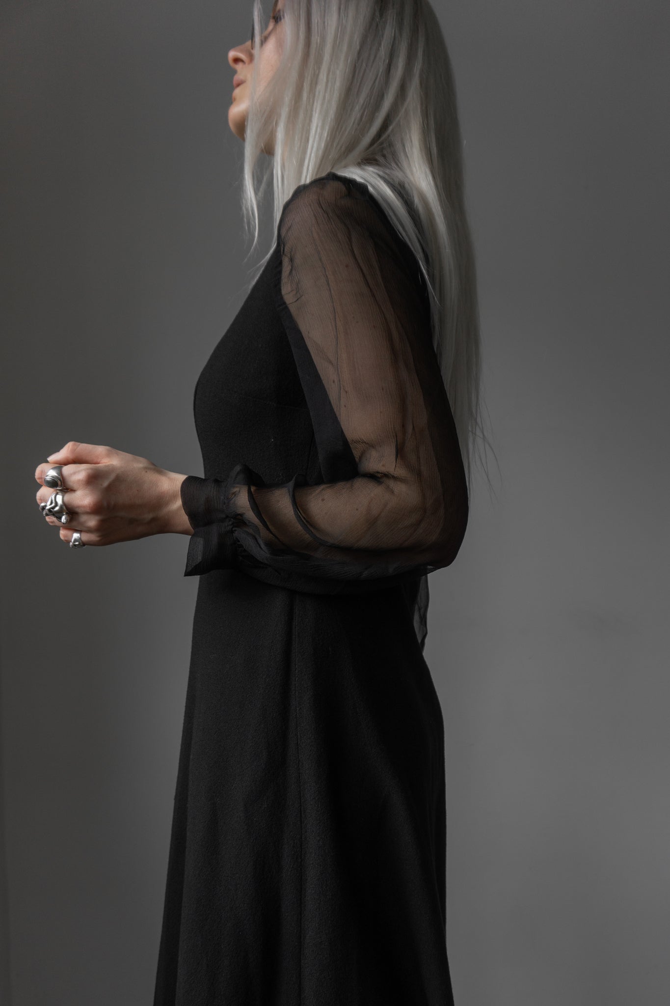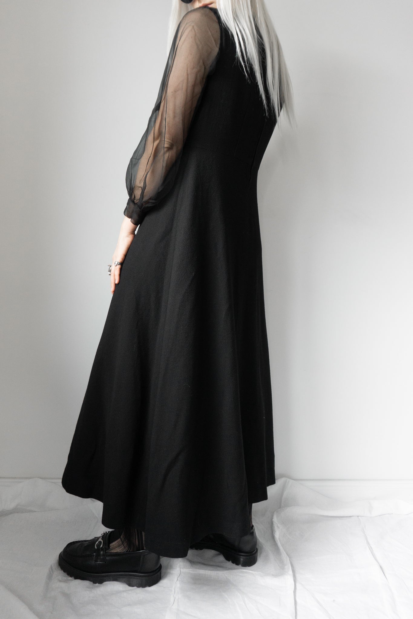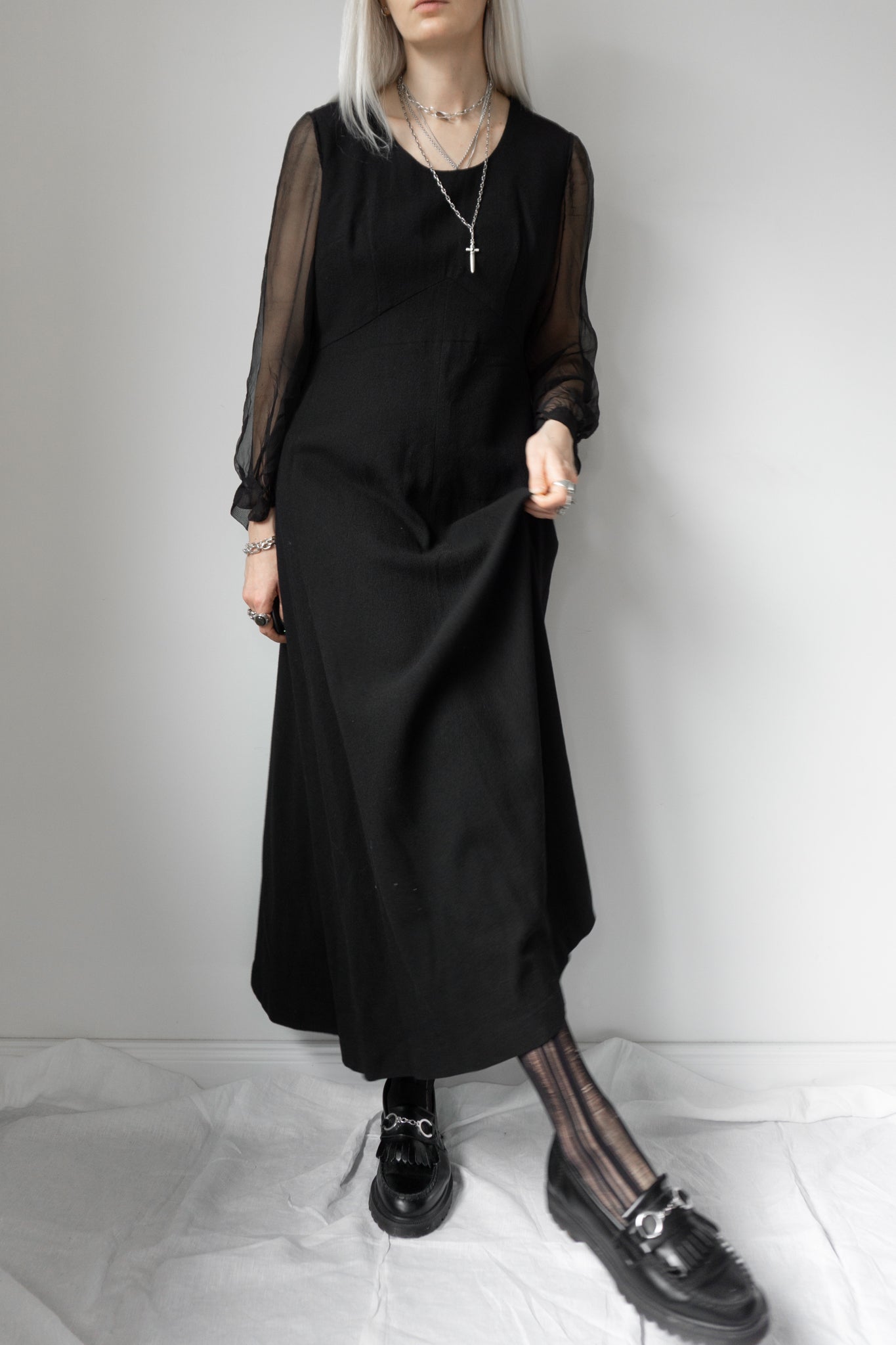 Schwarzes Maxikleid im Edwardian Look. Reine Schurwolle (nicht kratzig) und transparenten Ärmeln aus Seide. Wird am Rücken mit einem Reißverschluß geschlossen.
