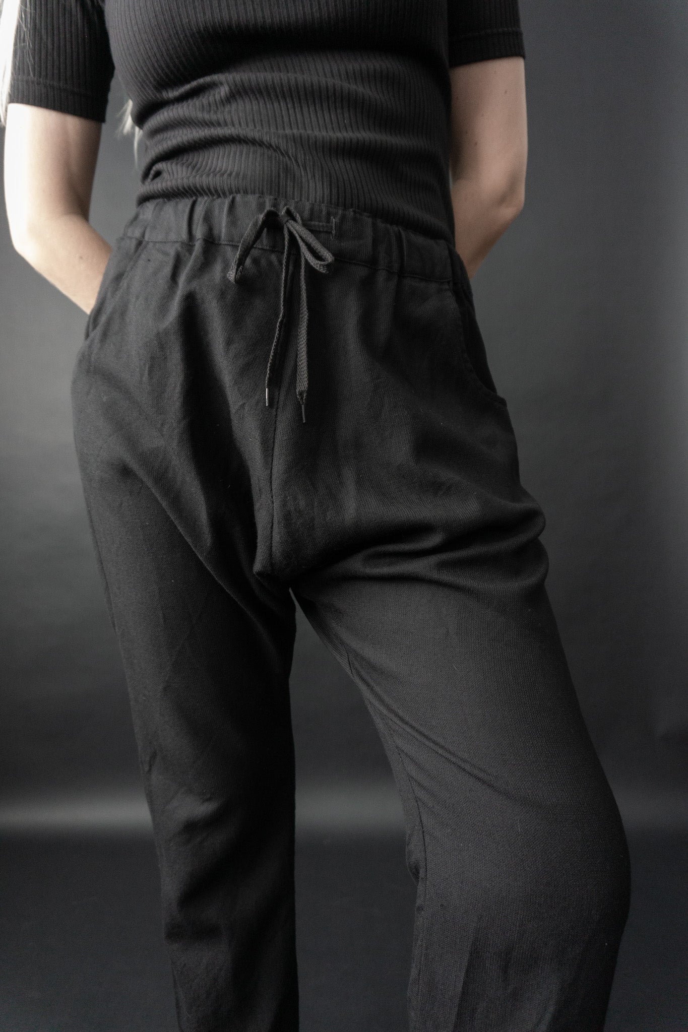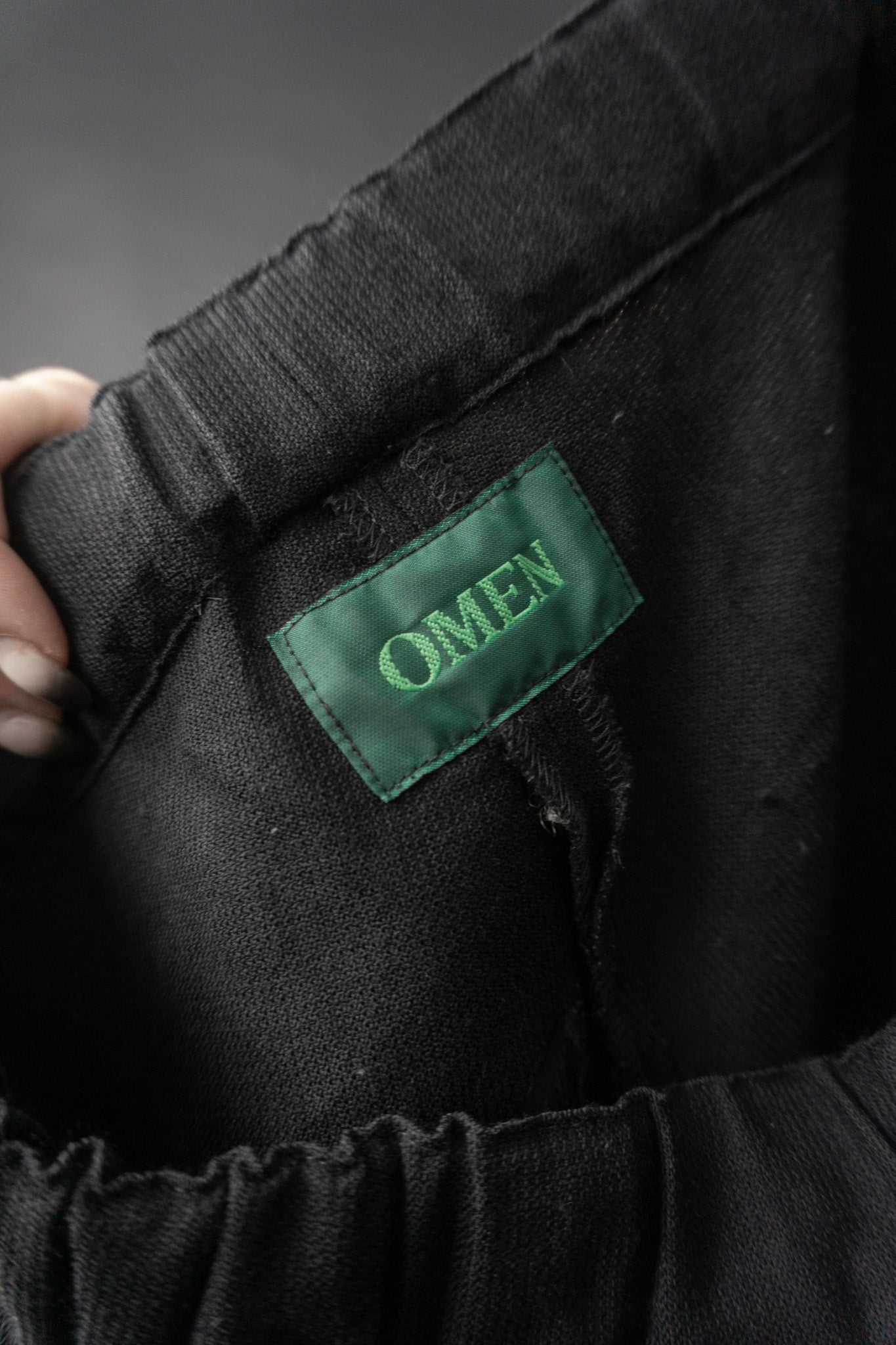 Schwarze Stoffhose von OMEN. Handgefertigt in Hamburg, sehr hoher Neupreis. Mit tiefem Schritt und elastischem Bund, sowie Kordel. Einige kleine Stellen wurden professionell repariert, fällt beim Tragen nicht auf.