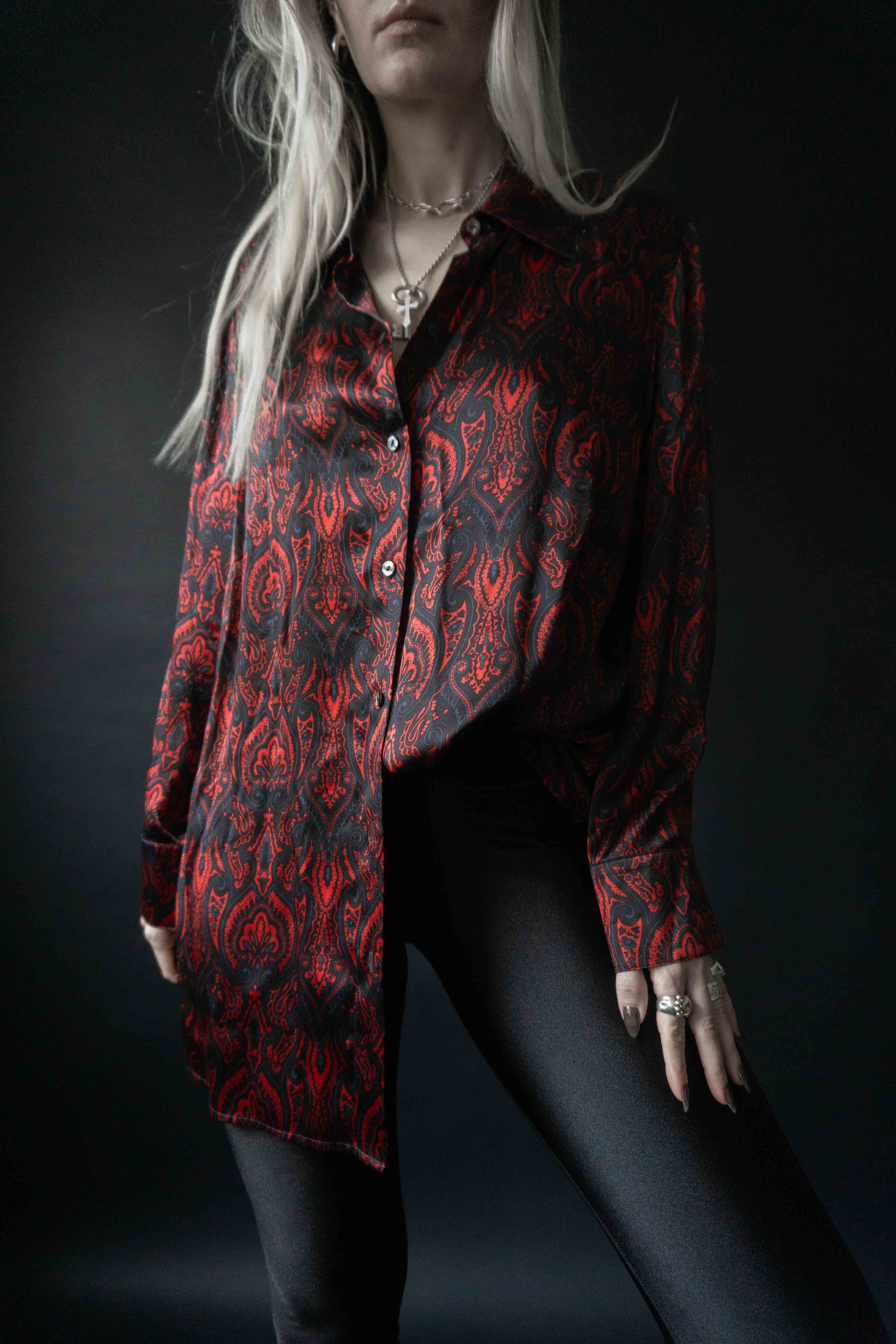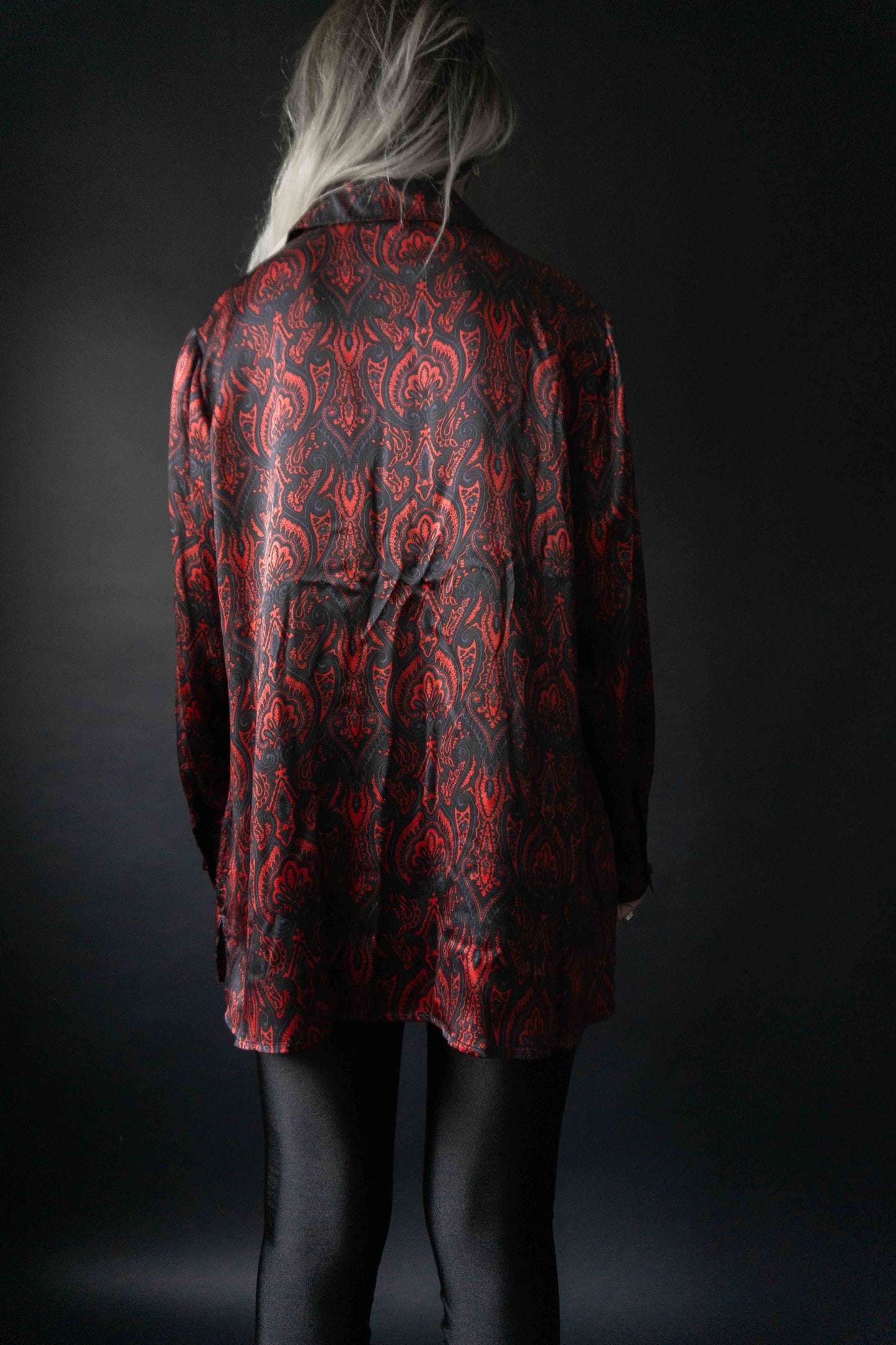 Diese luxuriöse Bluse ist wie gemacht für die Dracula’s Office Edition. Der Seidenstoff fällt wunderschön und das dunkelrot-schwarze Paisley-Muster sorgt für eine edle, düstere Wirkung. Ein wahres Vintage-Schmuckstück – perfekt für formelle Looks mit dunklem Twist.