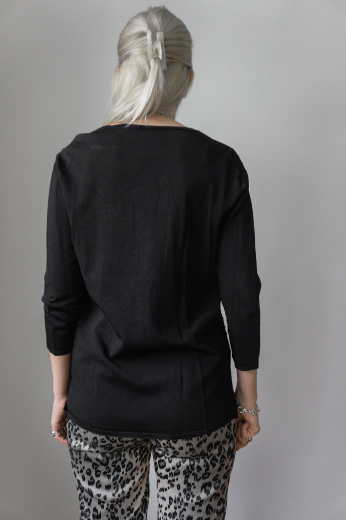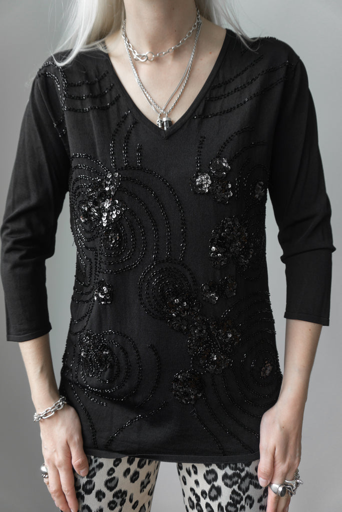 Leichtes Shirt mit aufwändiger Pailettenverzierung. Sehr cool zum Layern mit Lederjacken, Blazern oder unter Strickjacken. Gerade bei all black Looks liebe ich es Struckturen wie Pailetten zu integrieren.