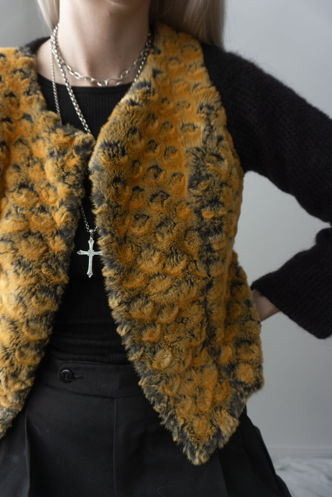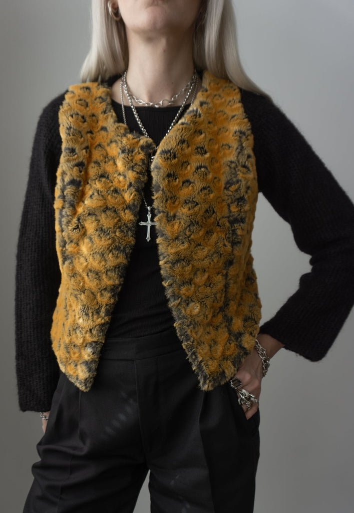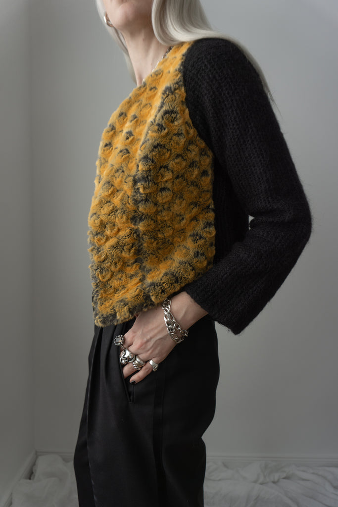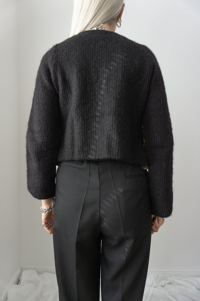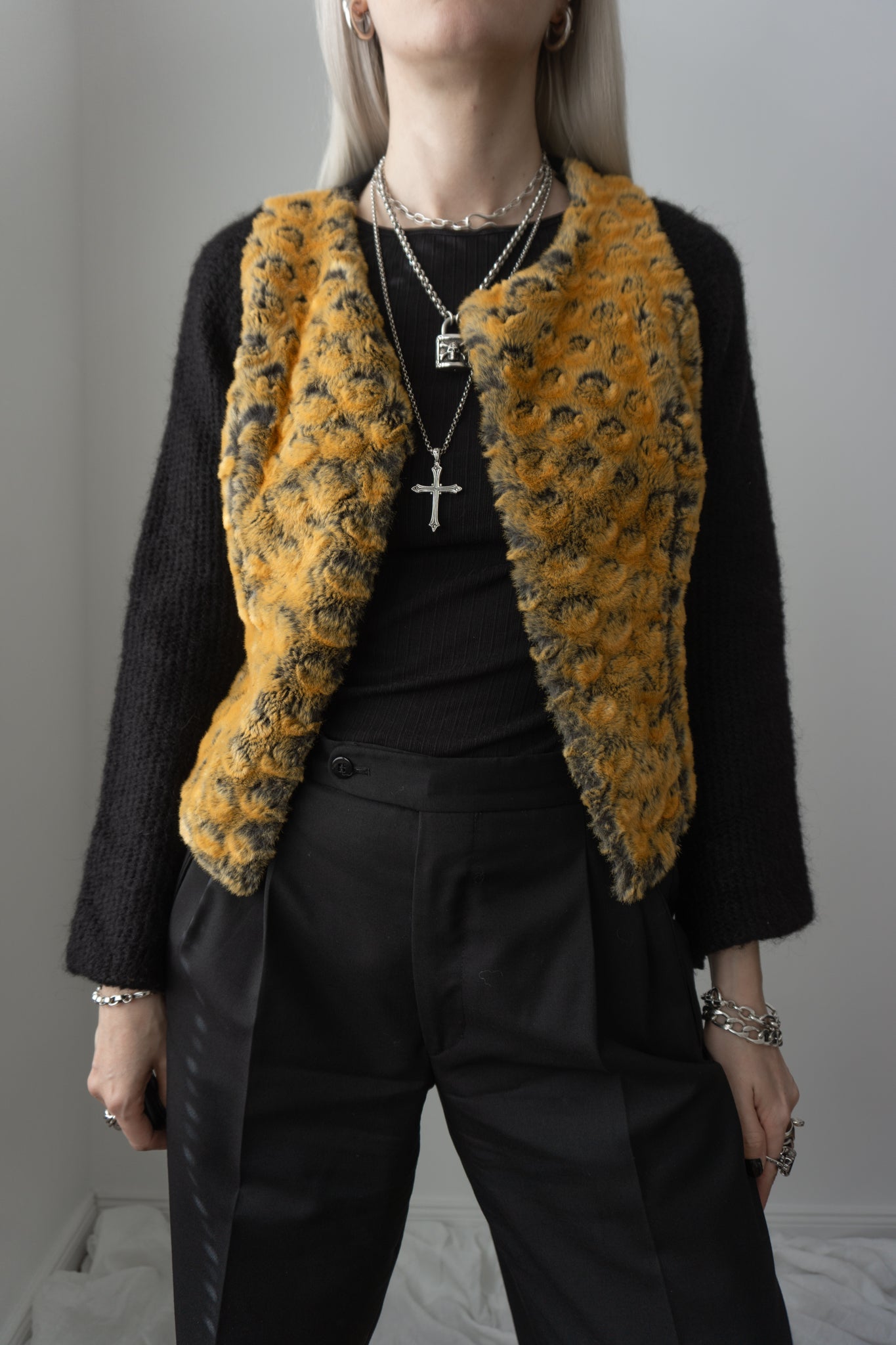 Schwarze Strickjacke mit Fake Fur auf der Vorderseite. Leicht cropped geschnitten und ein echter Eyecatcher. Kann vorne mir drei Hakenverschlüssen geschlossen werden oder einfach offen getragen werden.