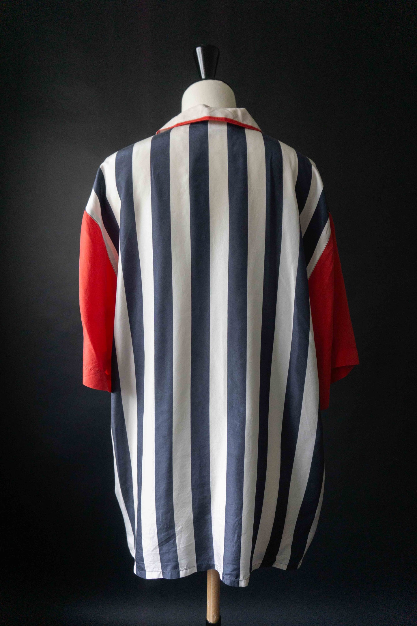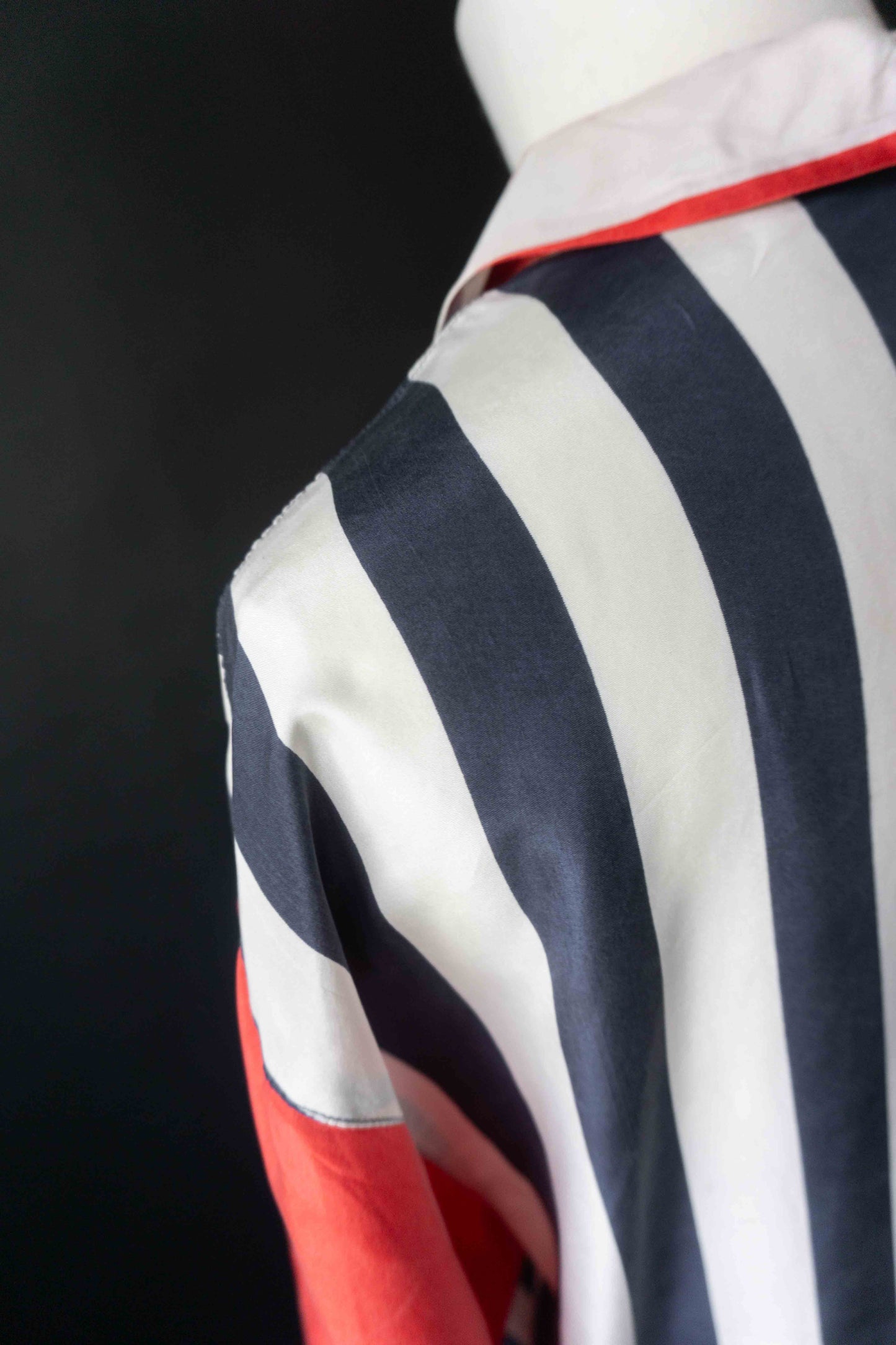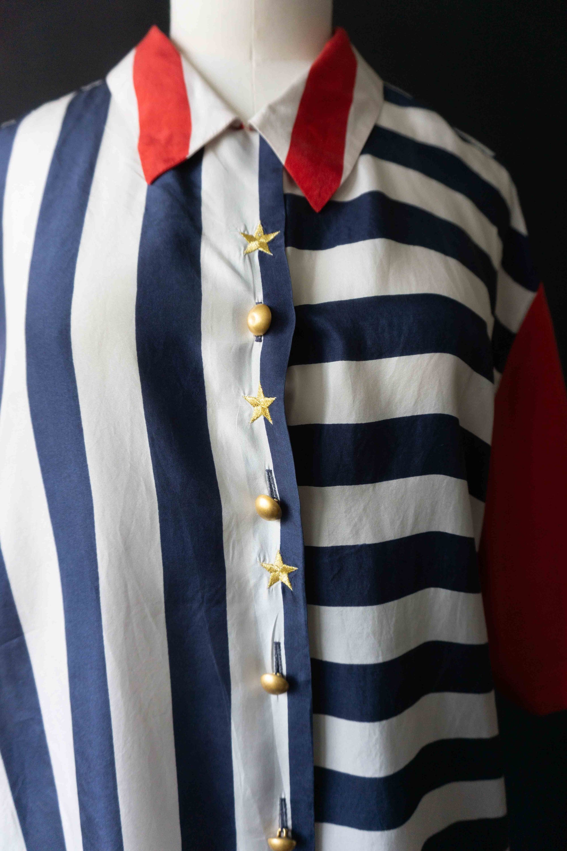 Diese 80s Bluse aus reiner Seide vereint maritimen Chic mit luxuriösen Details. Die Kombination aus Blau, Weiß und Rot erinnert an klassische Navy-Looks, während die goldenen Schmuckknöpfe und aufgestickten Sterne einen Hauch von Extravaganz verleihen. Ein Vintage-Piece, das Eleganz und Verspieltheit perfekt vereint!
