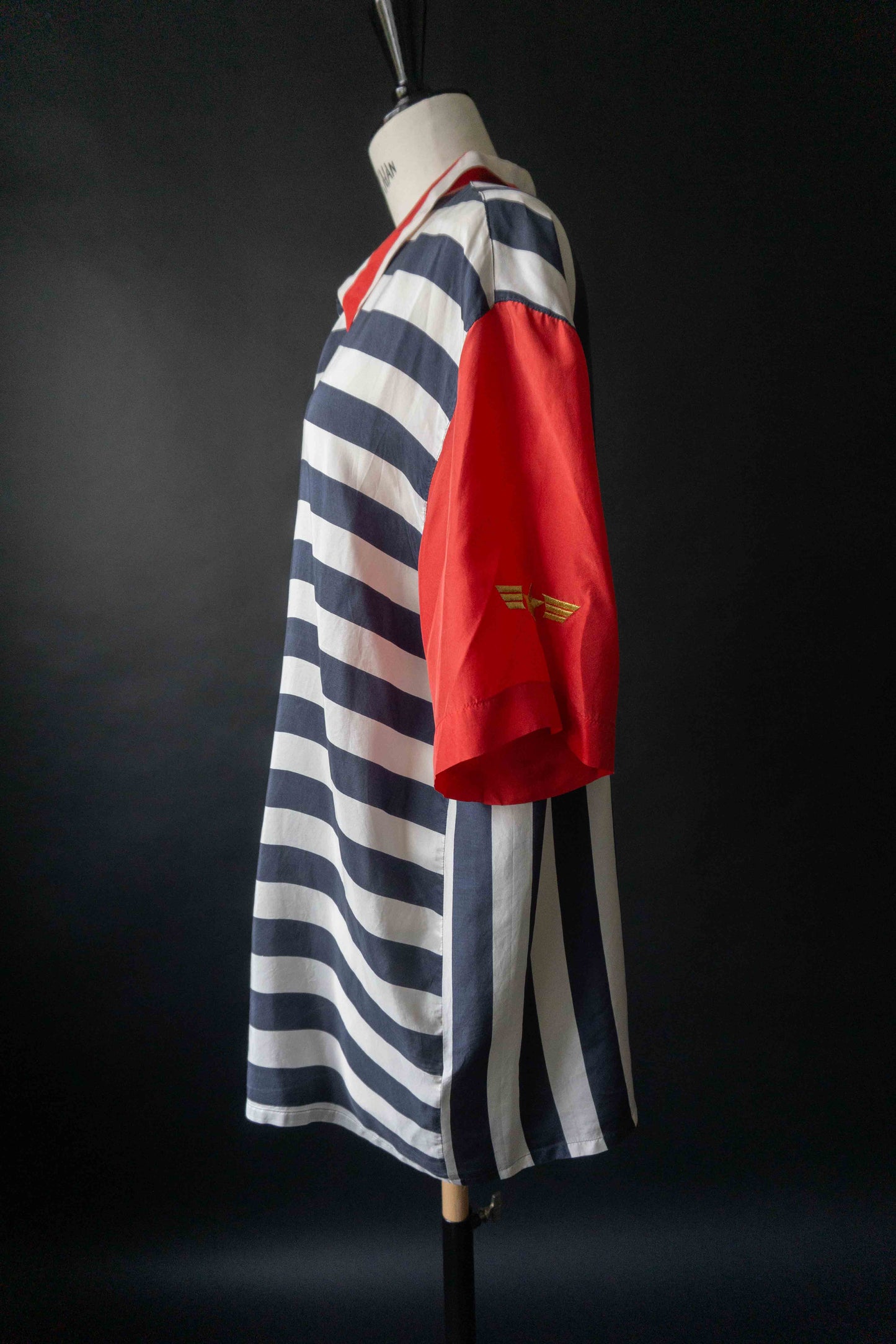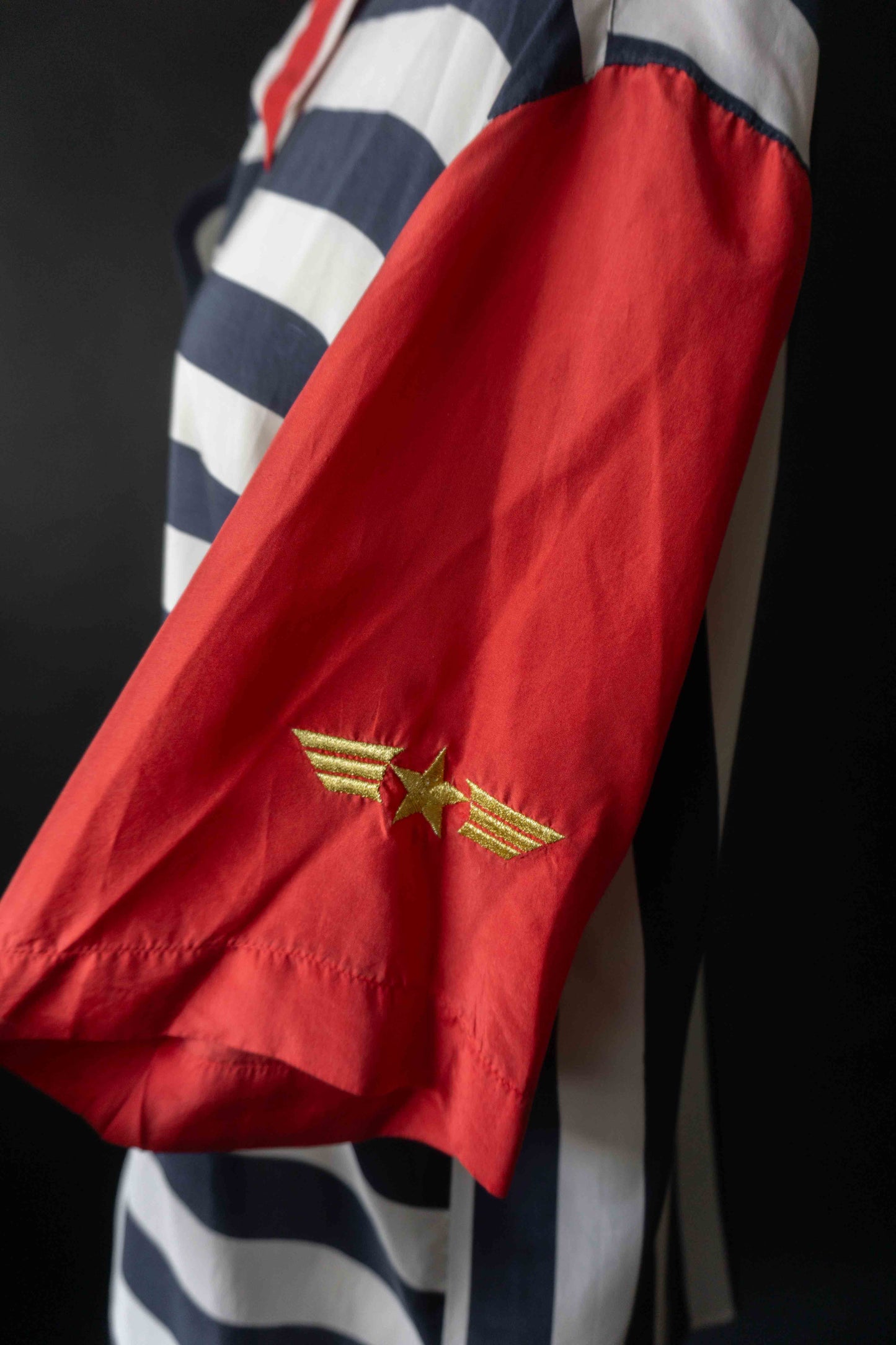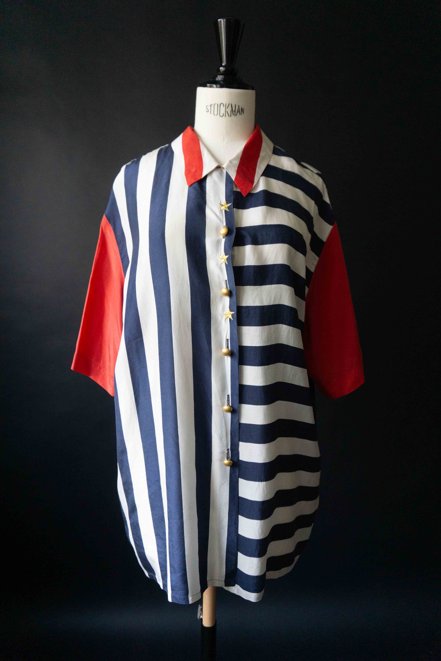 Diese 80s Bluse aus reiner Seide vereint maritimen Chic mit luxuriösen Details. Die Kombination aus Blau, Weiß und Rot erinnert an klassische Navy-Looks, während die goldenen Schmuckknöpfe und aufgestickten Sterne einen Hauch von Extravaganz verleihen. Ein Vintage-Piece, das Eleganz und Verspieltheit perfekt vereint!