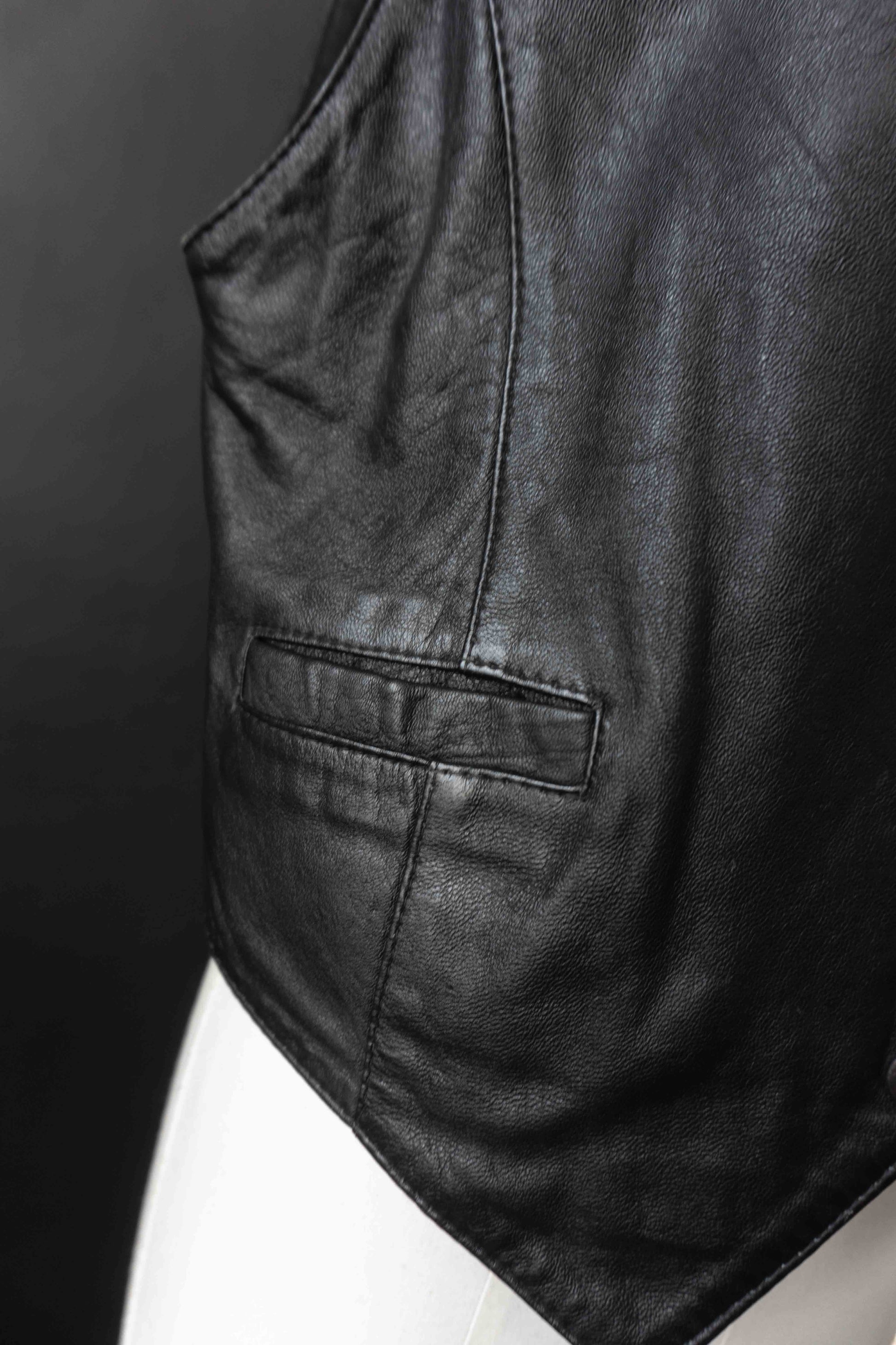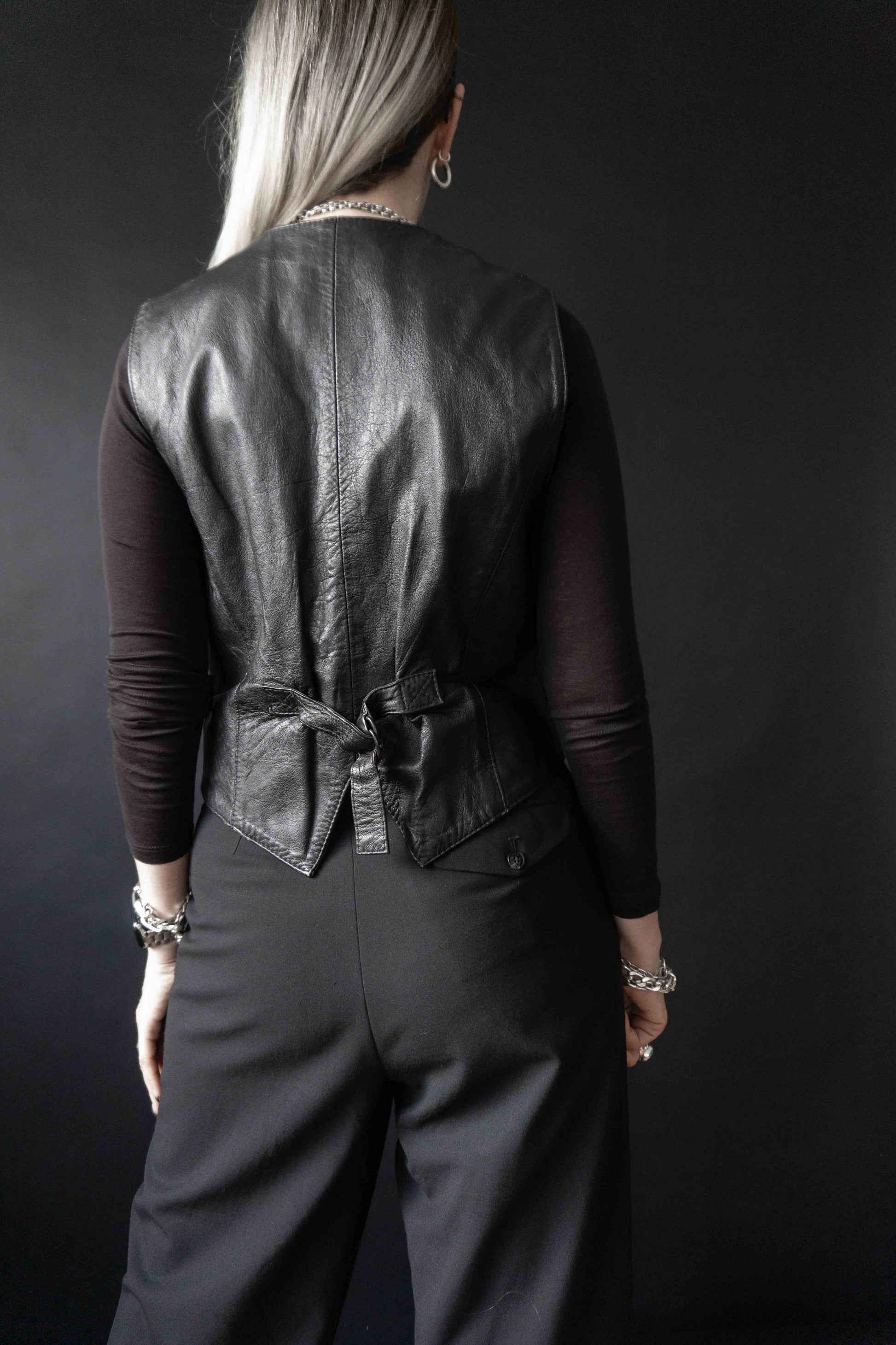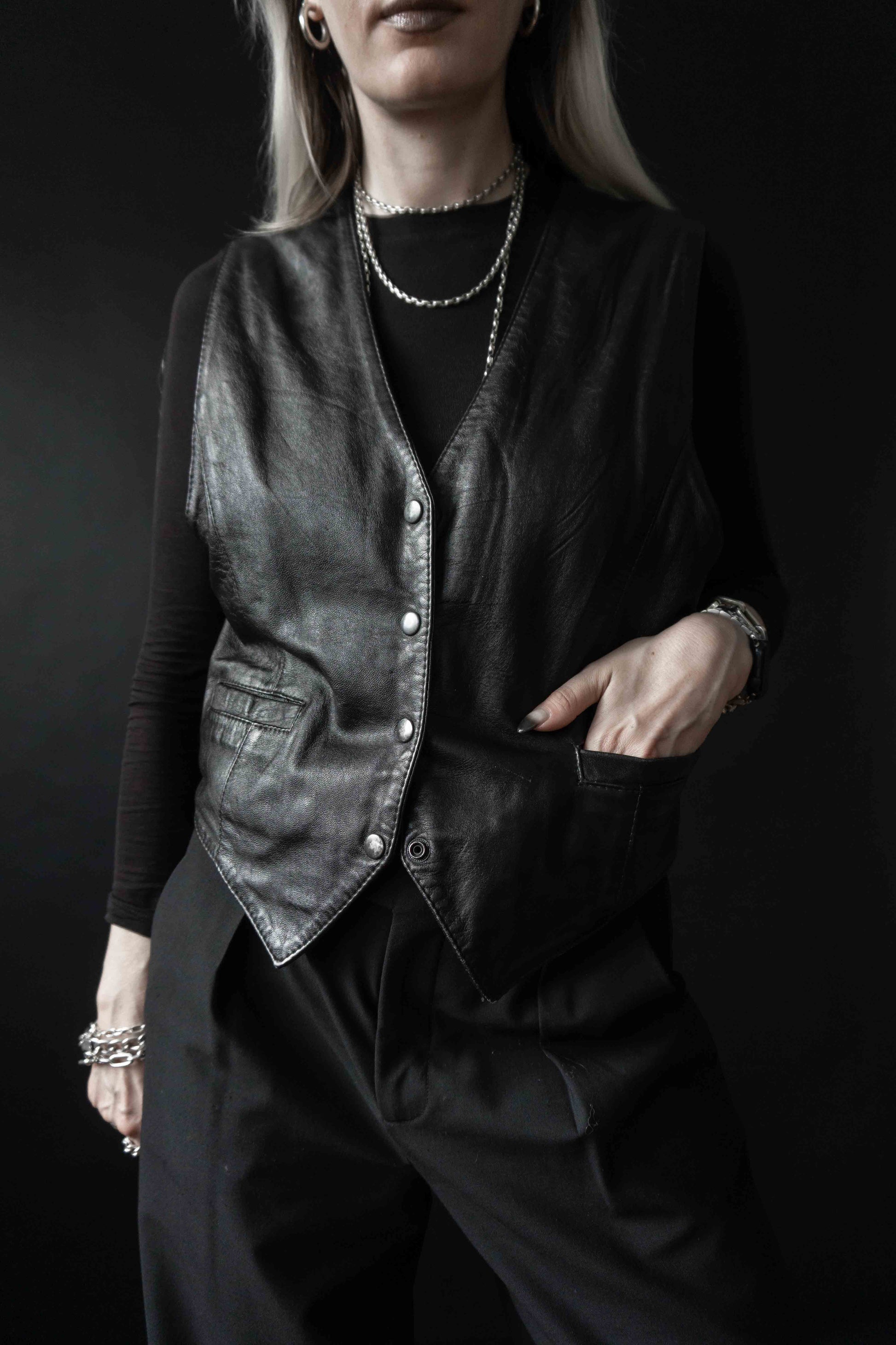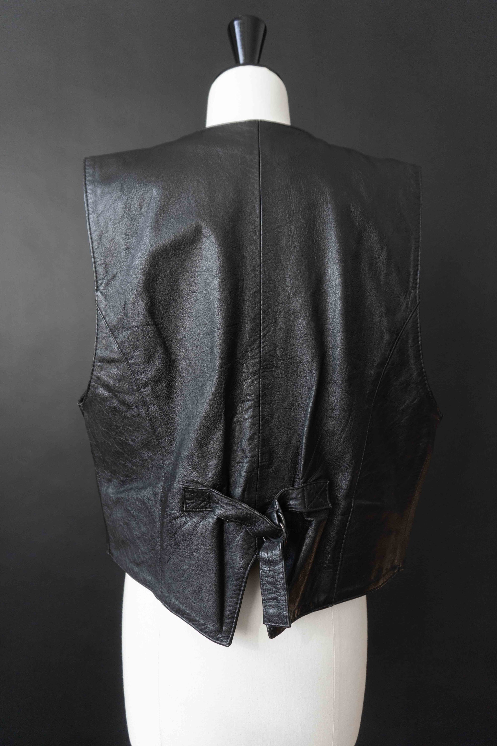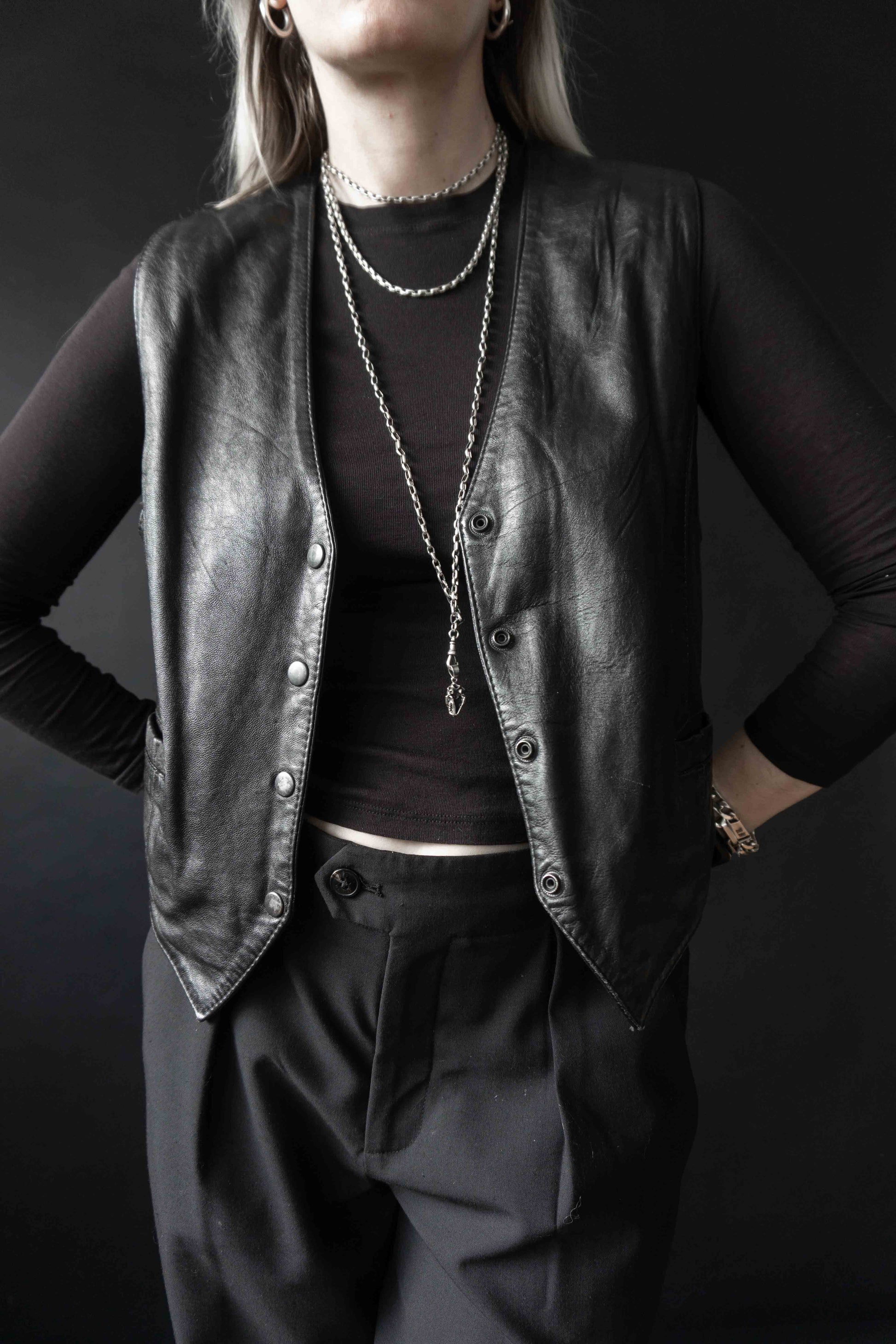 Diese schwarze 80s Lederweste mit oversized Fit und silberner Hardware ist ein wahres Highlight für Vintage-Fans. Die Druckknöpfe und verstellbare Rückenschnalle sorgen für eine perfekte Passform, während die hochwertige Verarbeitung für einen langlebigen Style sorgt. Perfekt für Gothic Vintage Mode oder als coole Ergänzung zu einer Vintage Damenmode-Kollektion.