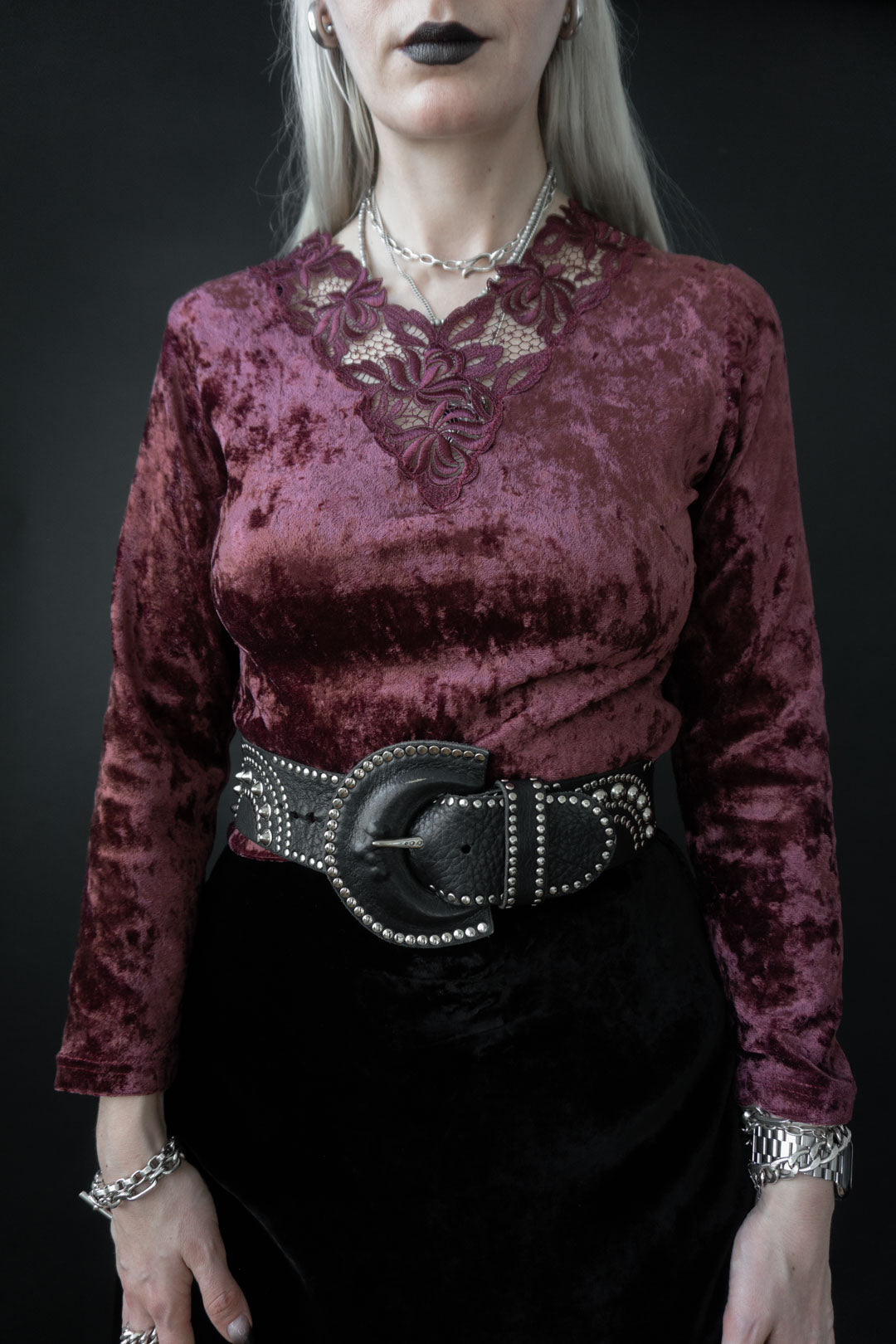 Dieses 90s Longsleeve aus schwarzem Samt mit zarter Spitze am Ausschnitt verbindet Eleganz mit einem Hauch Vampy-Gothic Ästhetik. Die weiche, anschmiegsame Qualität sorgt für hohen Tragekomfort, während das detailreiche Design perfekt für Liebhaber:innen von Gothic Vintage Mode und nachhaltiger Vintage Kleidung ist. Ein zeitloses Statement-Piece für besondere Outfits. Es gibt das Shirt auch noch in Weinrot, ihr findet es hier (s. Bild 5).