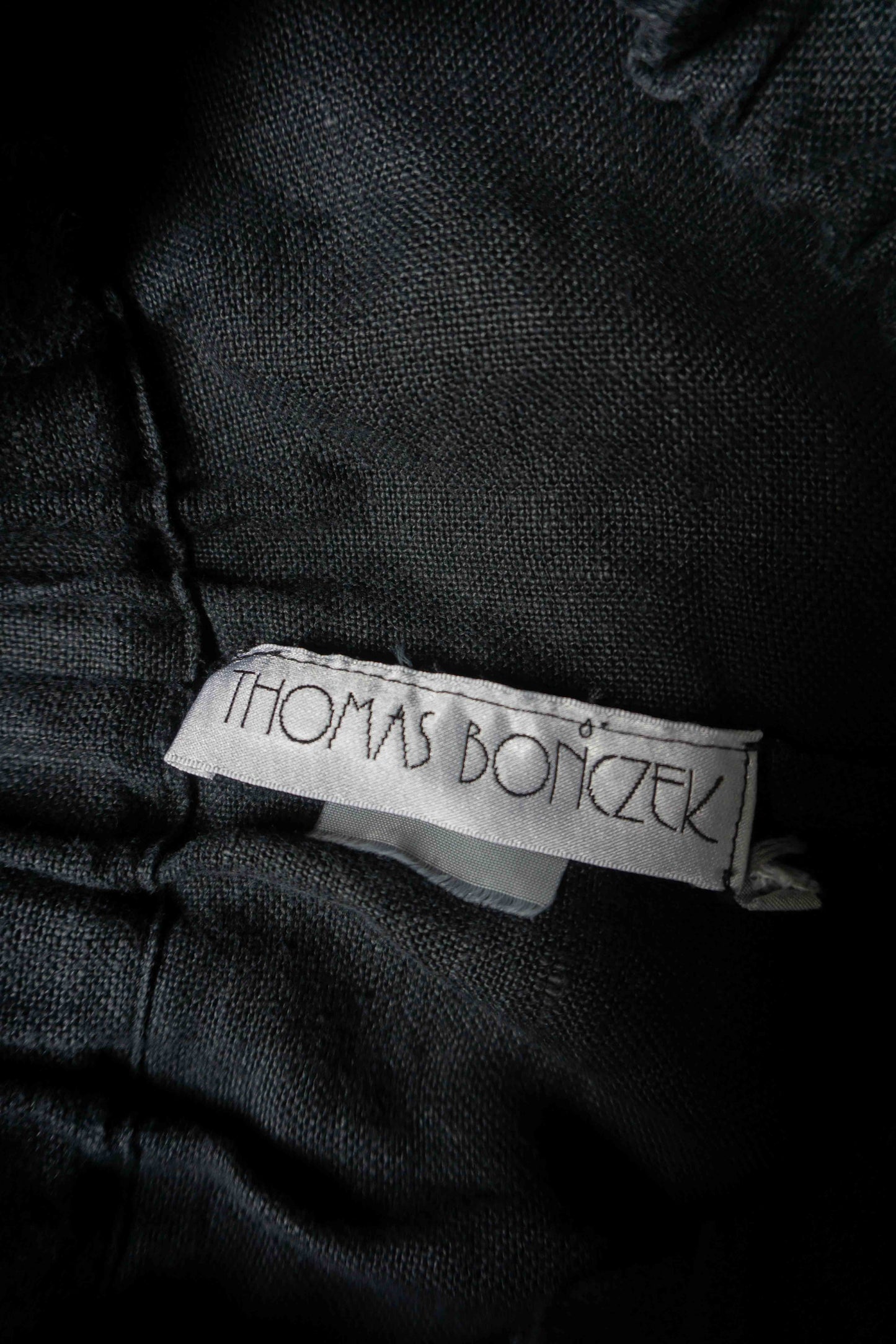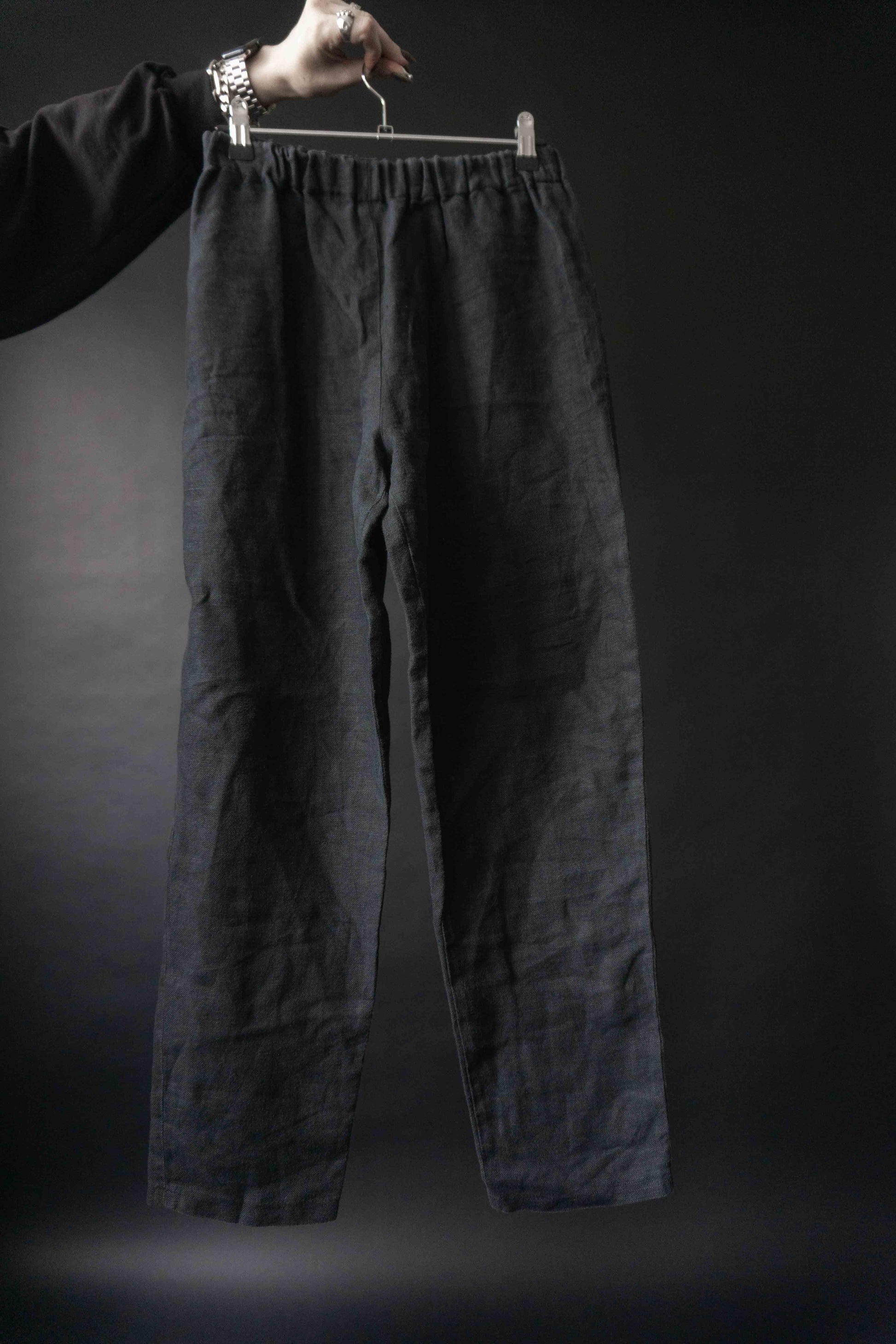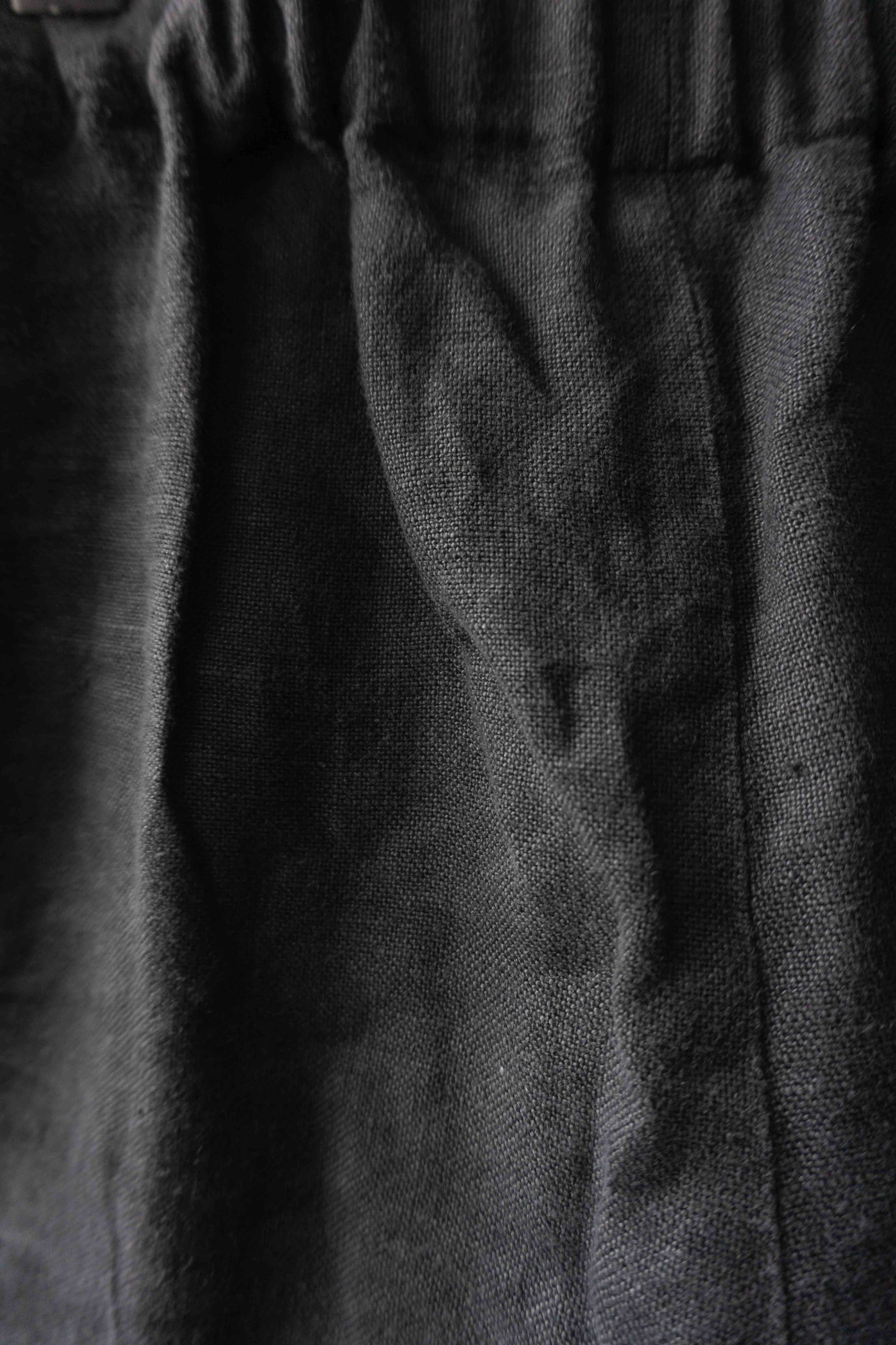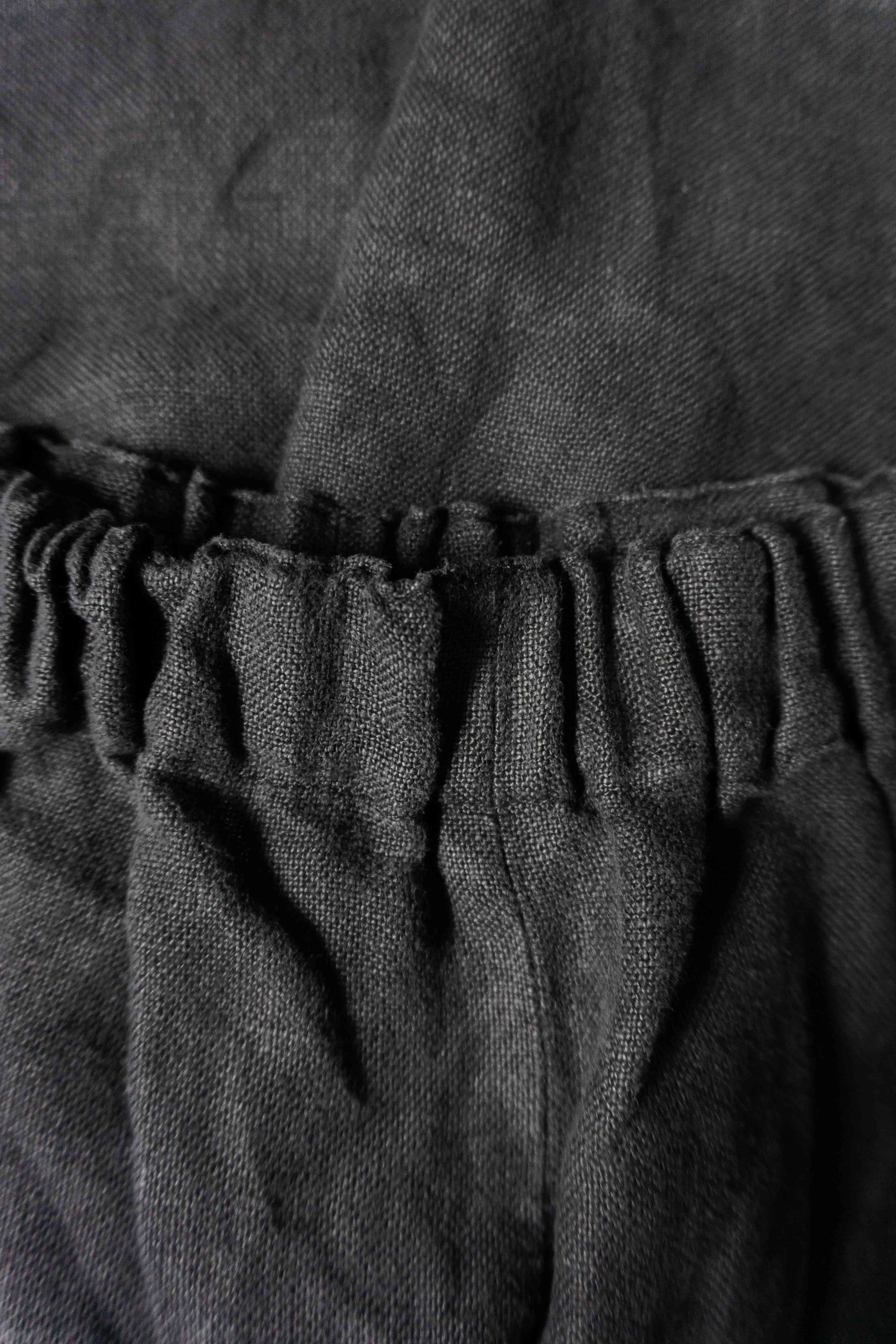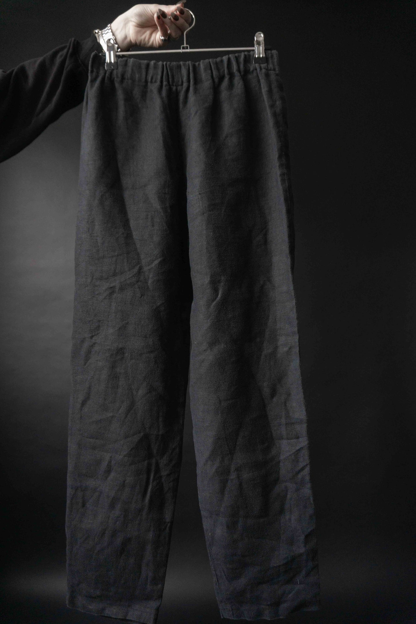 Minimalistische Leinenhose in Schwarz vom Designer Thomas Bonczek. Gummibund, leicht konisch geschnitten, weicher Griff. Größe XS–S. Ideal für Capsule Wardrobe oder für einen puristischen Sommerlook.